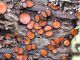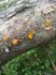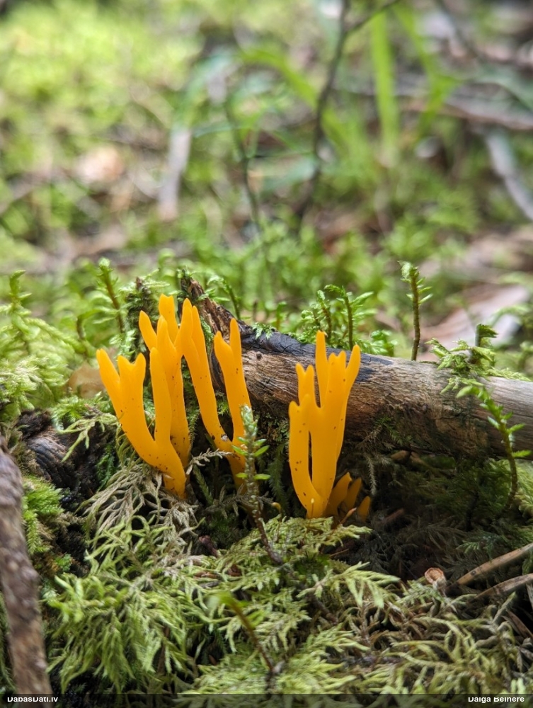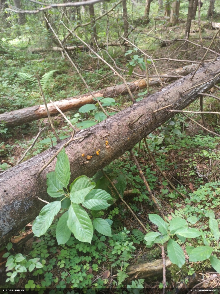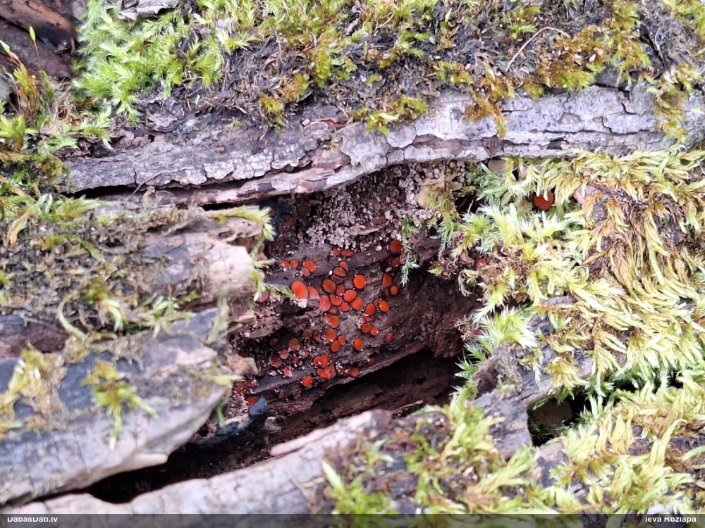 Man pēkšņi radās ideja - vai tur bija nu ļoti mitrs mikroklimats, egle ar melnalksni? Hipotētiski tādas dzeltenas var būt Diachea muscorum. Te bilde ir mazliet līdzīga: https://fr.wikipedia.org/wiki/Fichier:Craterium_muscorum,_Trawscoed,_North_Wales,_Aug_2016_-_Flickr_-_janetgraham84.jpg