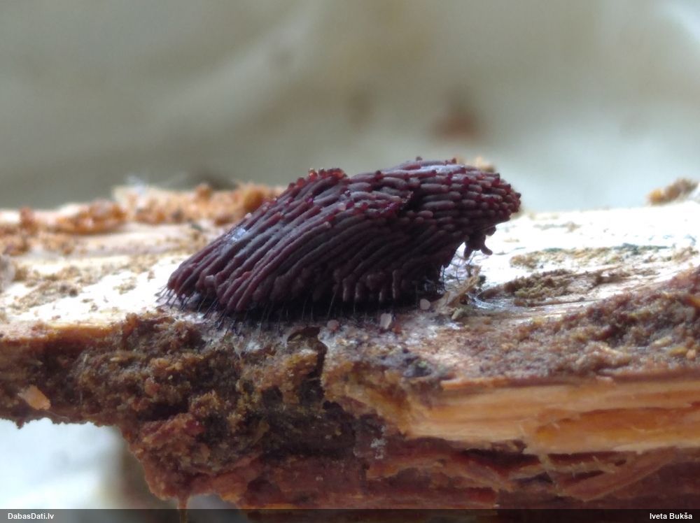 Šobrīd varu iedomāties 2 variantus - melnā plaispika Amaurochaete atra vai parastais gļotpūpēdis Reticularia lycoperdon. Pēc izmēra, augšanas laika un augšanas uz apstrādāta koka atbilst abas.