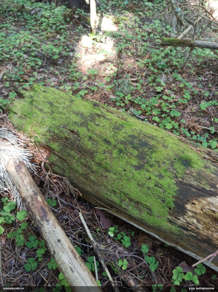 Satrūdējusi kritala mežā, nav dēļi. Iespējams, egle, jauktu koku mežs.