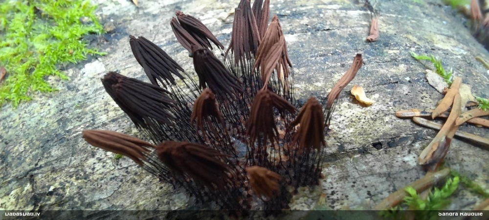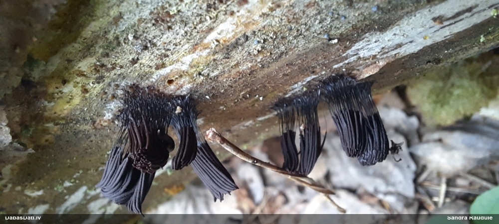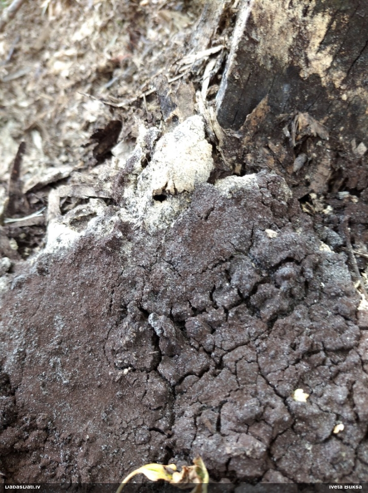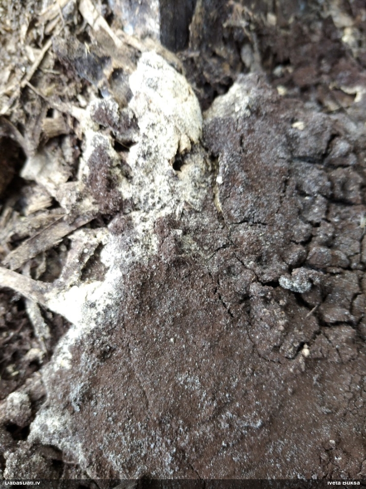 Šobrīd varu iedomāties 2 variantus - melnā plaispika Amaurochaete atra vai parastais gļotpūpēdis Reticularia lycoperdon. Pēc izmēra, augšanas laika un augšanas uz apstrādāta koka atbilst abas.