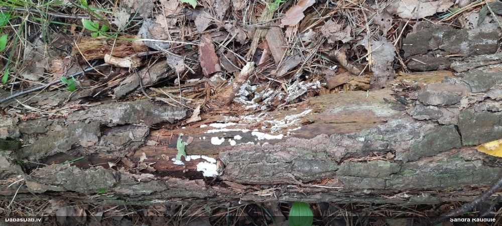 Satrūdējusi kritala mežā, nav dēļi. Iespējams, egle, jauktu koku mežs.