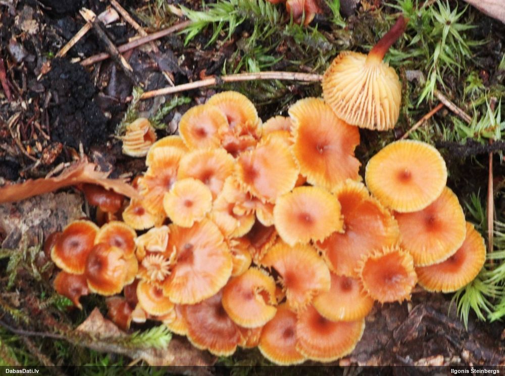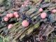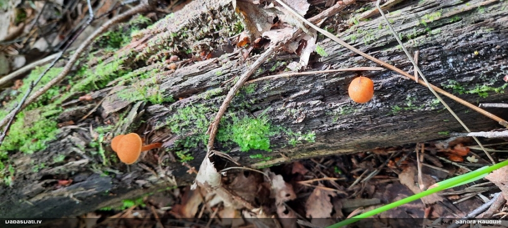 Man pēkšņi radās ideja - vai tur bija nu ļoti mitrs mikroklimats, egle ar melnalksni? Hipotētiski tādas dzeltenas var būt Diachea muscorum. Te bilde ir mazliet līdzīga: https://fr.wikipedia.org/wiki/Fichier:Craterium_muscorum,_Trawscoed,_North_Wales,_Aug_2016_-_Flickr_-_janetgraham84.jpg