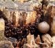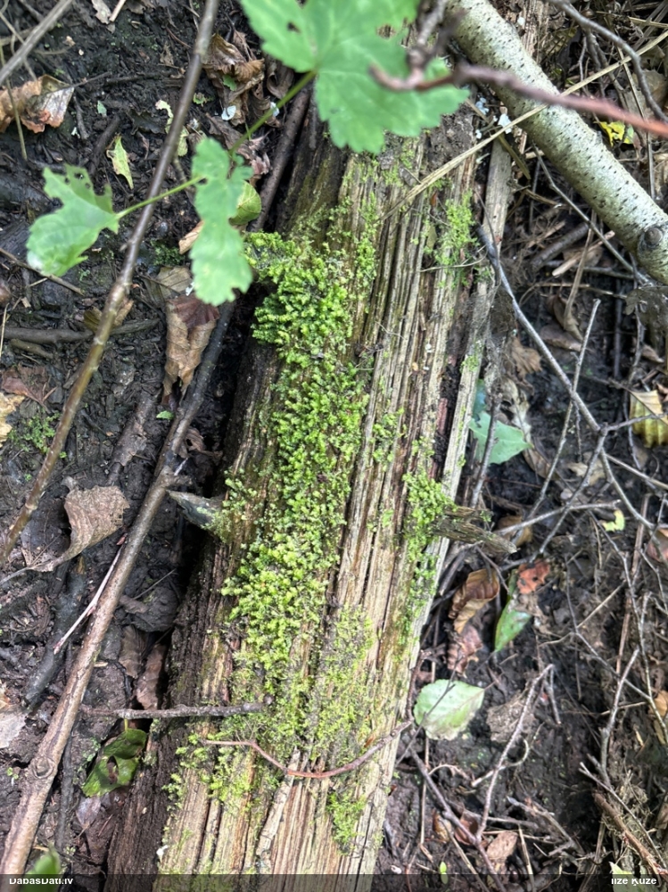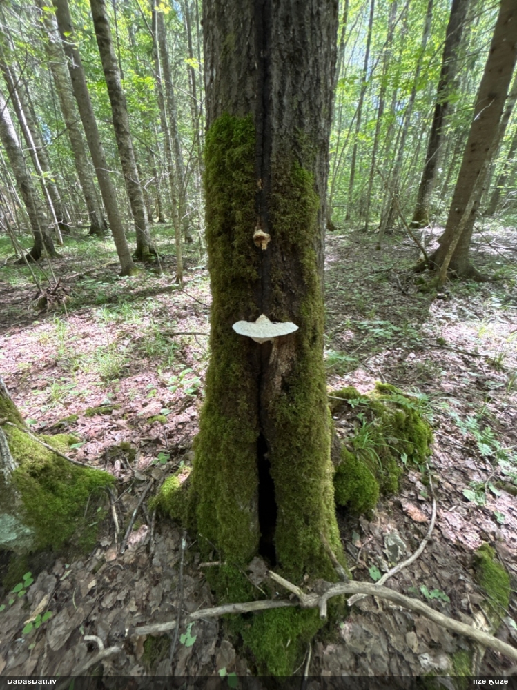 Satrūdējusi kritala mežā, nav dēļi. Iespējams, egle, jauktu koku mežs.