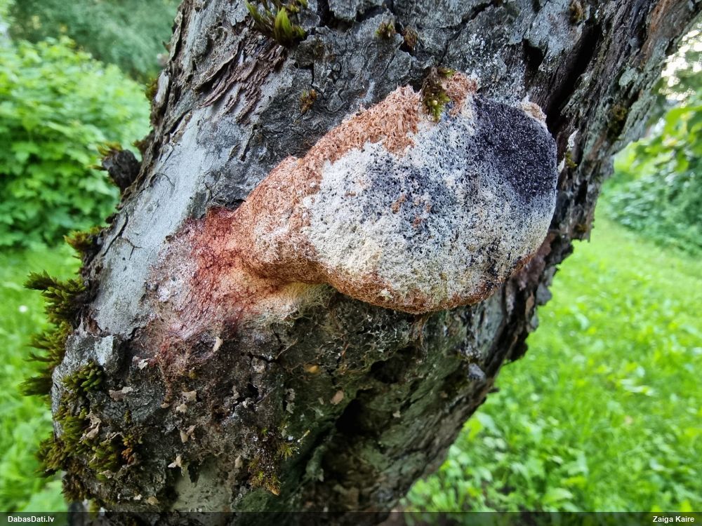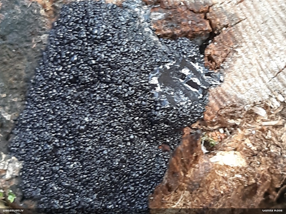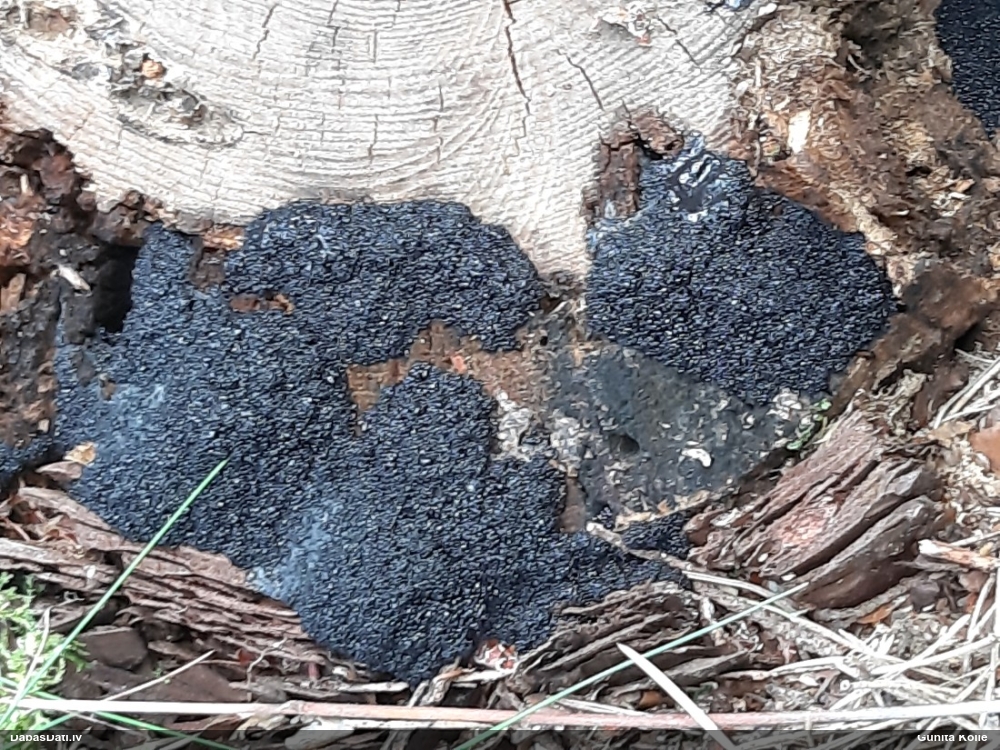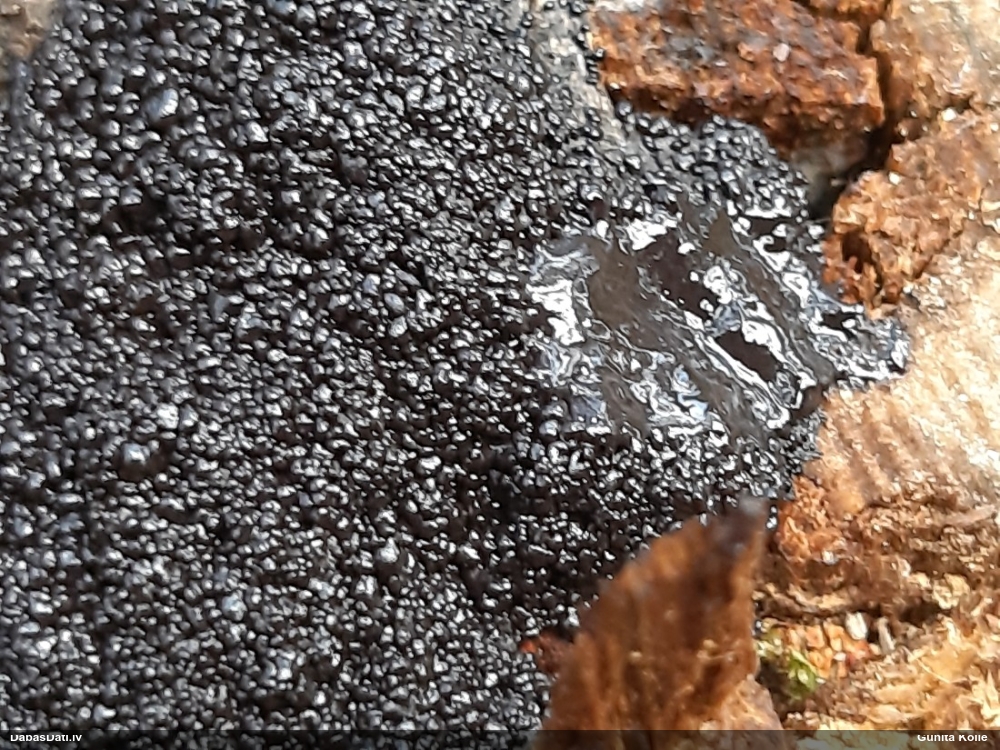 Šobrīd varu iedomāties 2 variantus - melnā plaispika Amaurochaete atra vai parastais gļotpūpēdis Reticularia lycoperdon. Pēc izmēra, augšanas laika un augšanas uz apstrādāta koka atbilst abas.