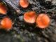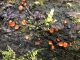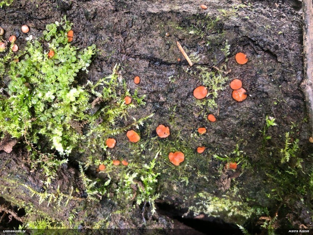 Man pēkšņi radās ideja - vai tur bija nu ļoti mitrs mikroklimats, egle ar melnalksni? Hipotētiski tādas dzeltenas var būt Diachea muscorum. Te bilde ir mazliet līdzīga: https://fr.wikipedia.org/wiki/Fichier:Craterium_muscorum,_Trawscoed,_North_Wales,_Aug_2016_-_Flickr_-_janetgraham84.jpg