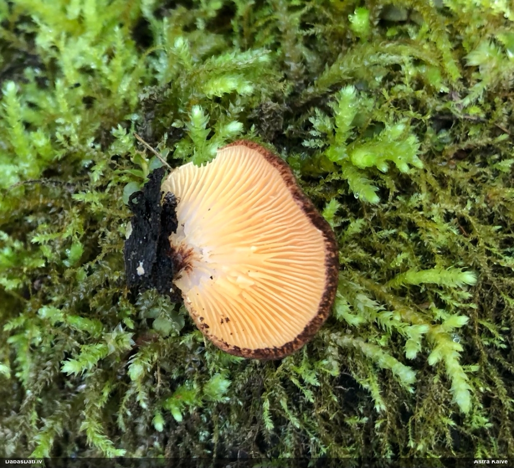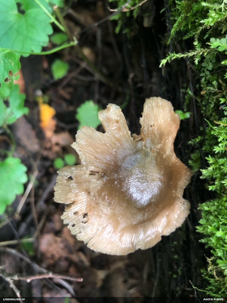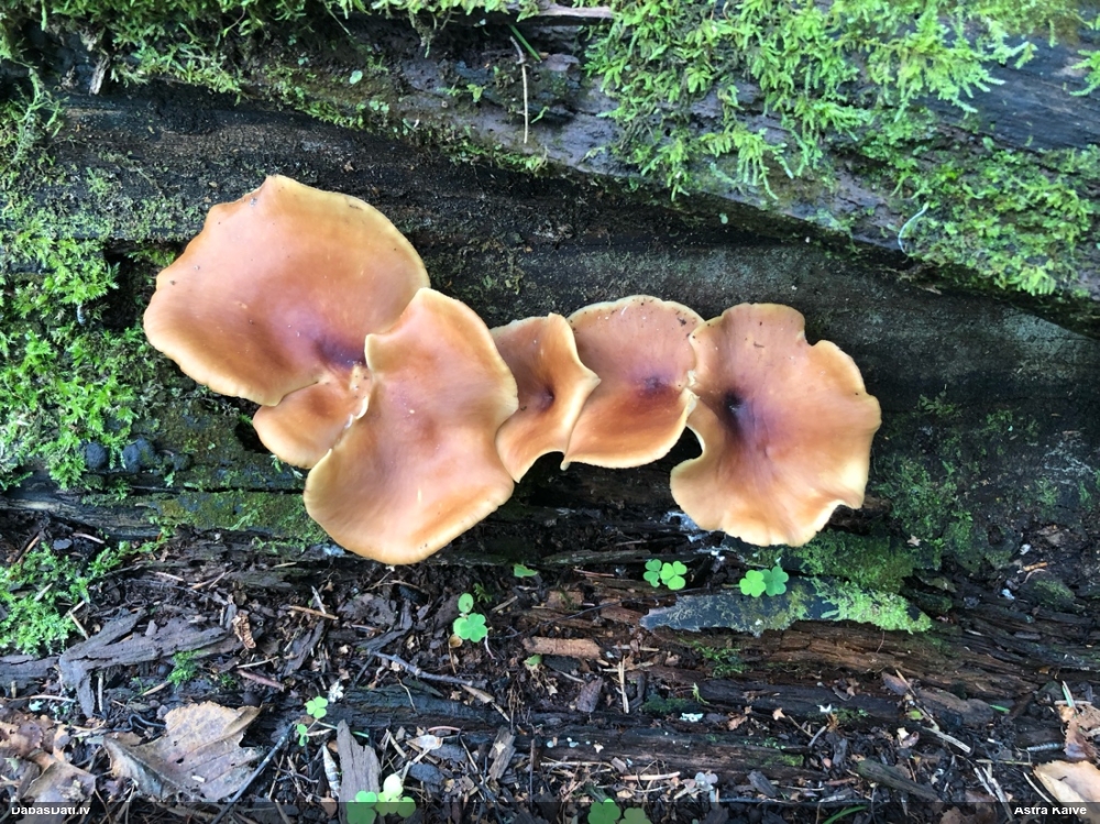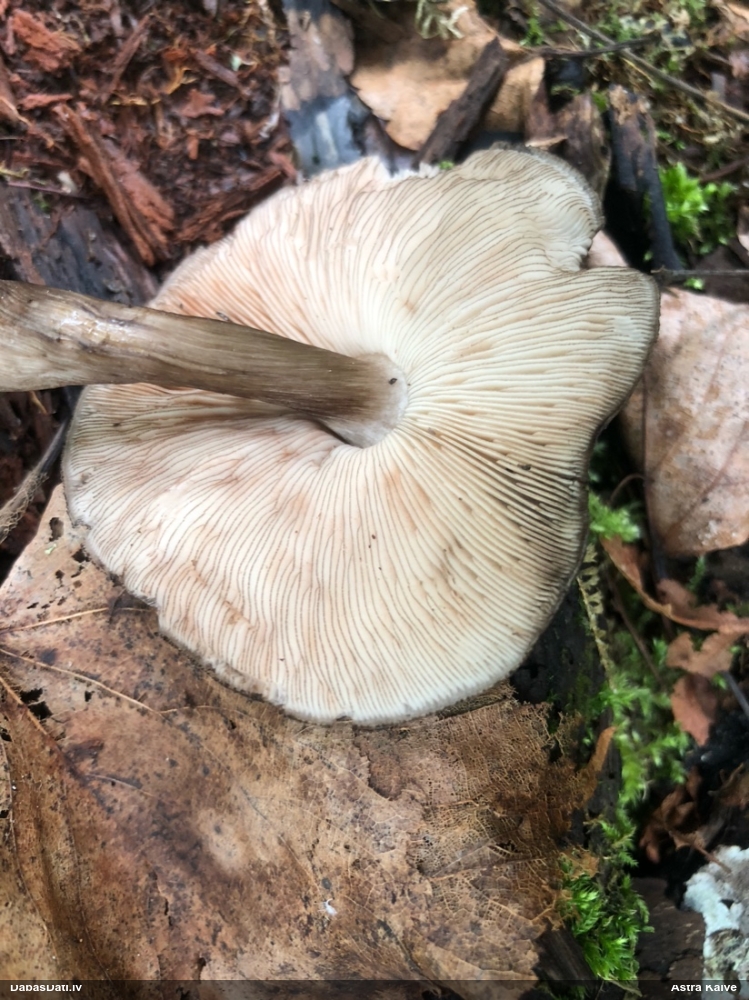 Es teiktu, ka Pleurotus cornucopiae: Cepurītes krāsa tik gaiši bēša nav pat vairākkārt salušām P.osteatus, bet šīs ir svaigi izaugušas. Lapiņas izteikti vērstas uz leju un veido kātiņa apakšā neregulāru rakstu, ko sauc par "anastomozes" tīklu.