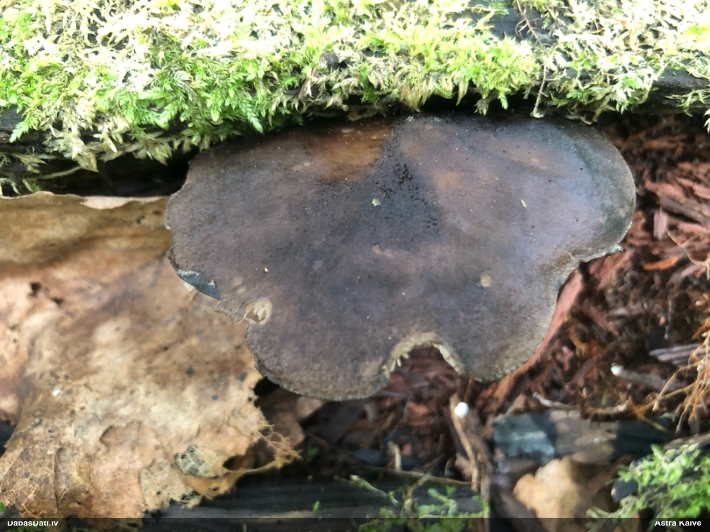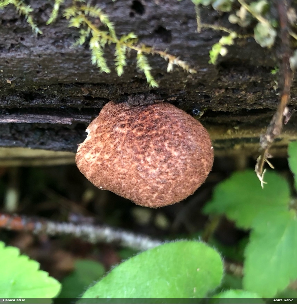 Šobrīd varu iedomāties 2 variantus - melnā plaispika Amaurochaete atra vai parastais gļotpūpēdis Reticularia lycoperdon. Pēc izmēra, augšanas laika un augšanas uz apstrādāta koka atbilst abas.