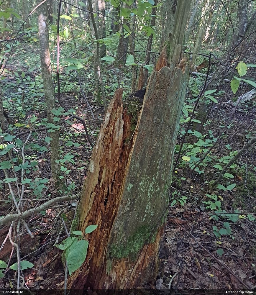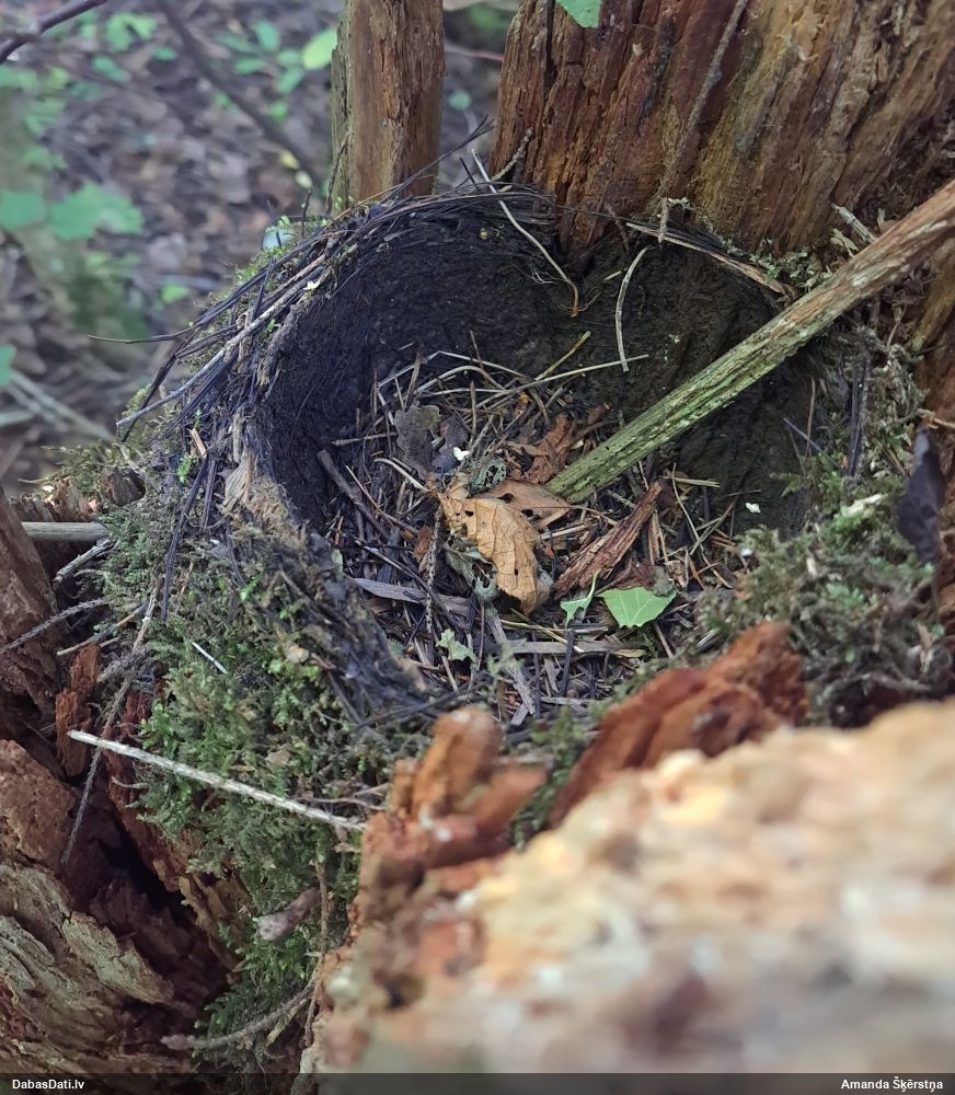 Satrūdējusi kritala mežā, nav dēļi. Iespējams, egle, jauktu koku mežs.