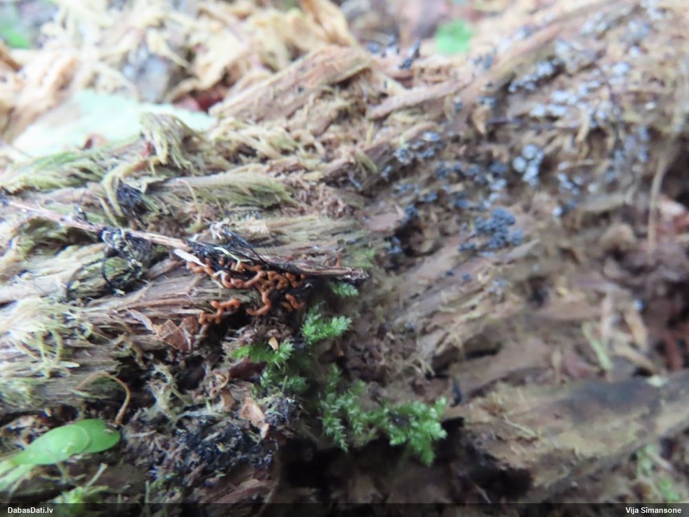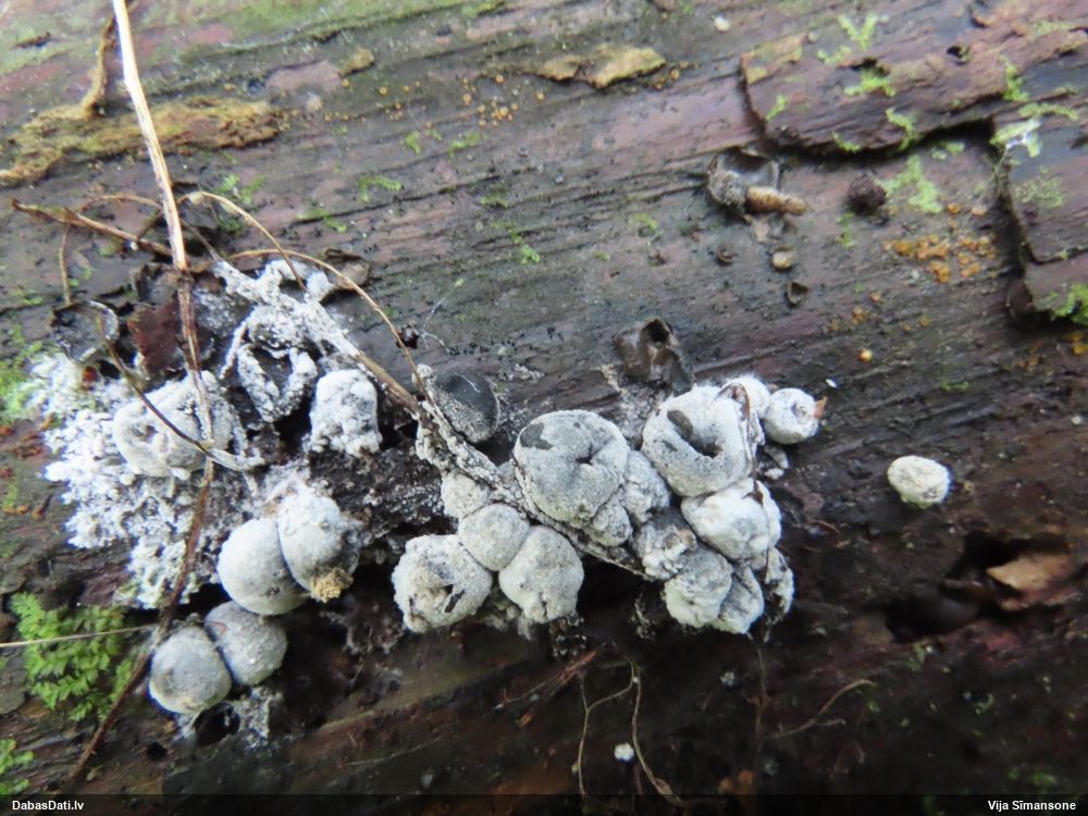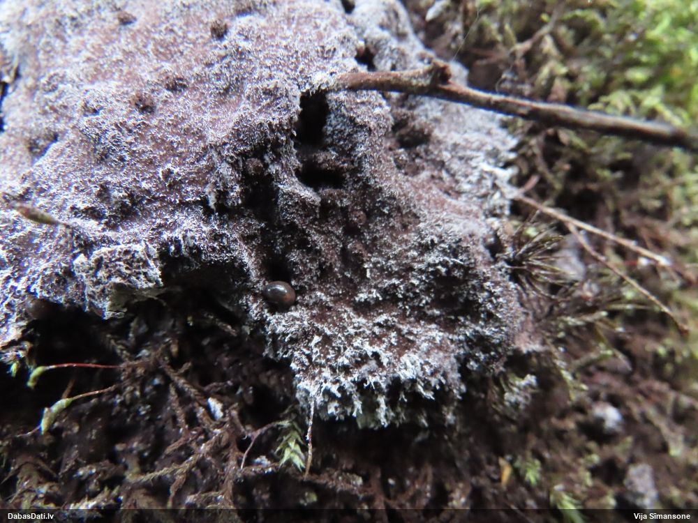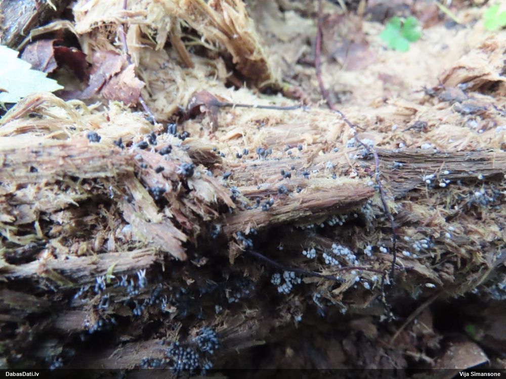 Šobrīd varu iedomāties 2 variantus - melnā plaispika Amaurochaete atra vai parastais gļotpūpēdis Reticularia lycoperdon. Pēc izmēra, augšanas laika un augšanas uz apstrādāta koka atbilst abas.