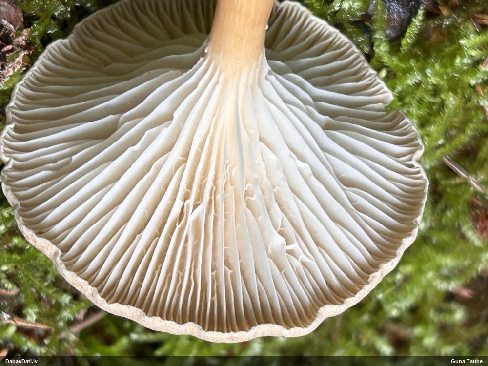 Es teiktu, ka Pleurotus cornucopiae: Cepurītes krāsa tik gaiši bēša nav pat vairākkārt salušām P.osteatus, bet šīs ir svaigi izaugušas. Lapiņas izteikti vērstas uz leju un veido kātiņa apakšā neregulāru rakstu, ko sauc par "anastomozes" tīklu.
