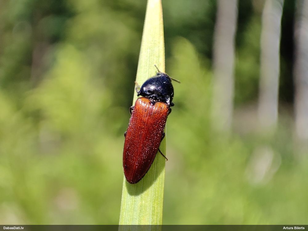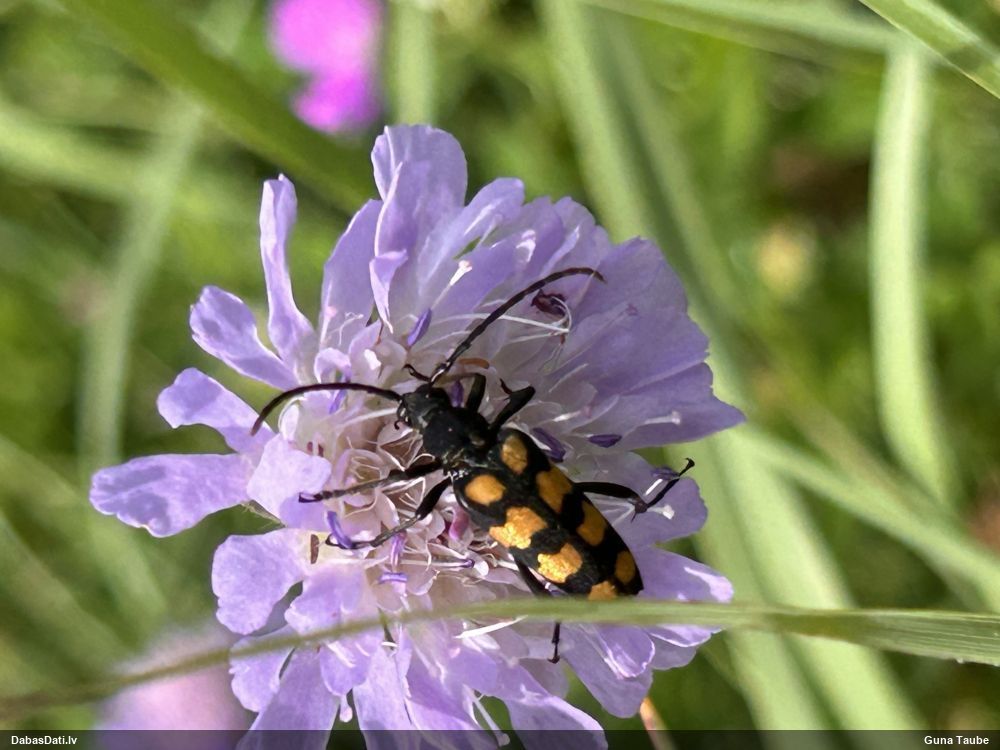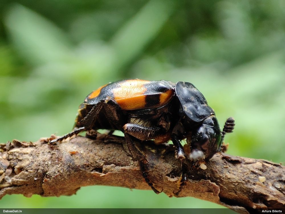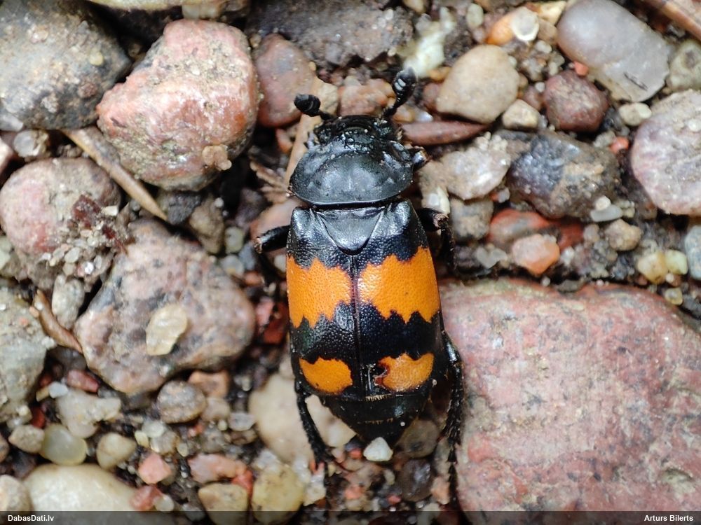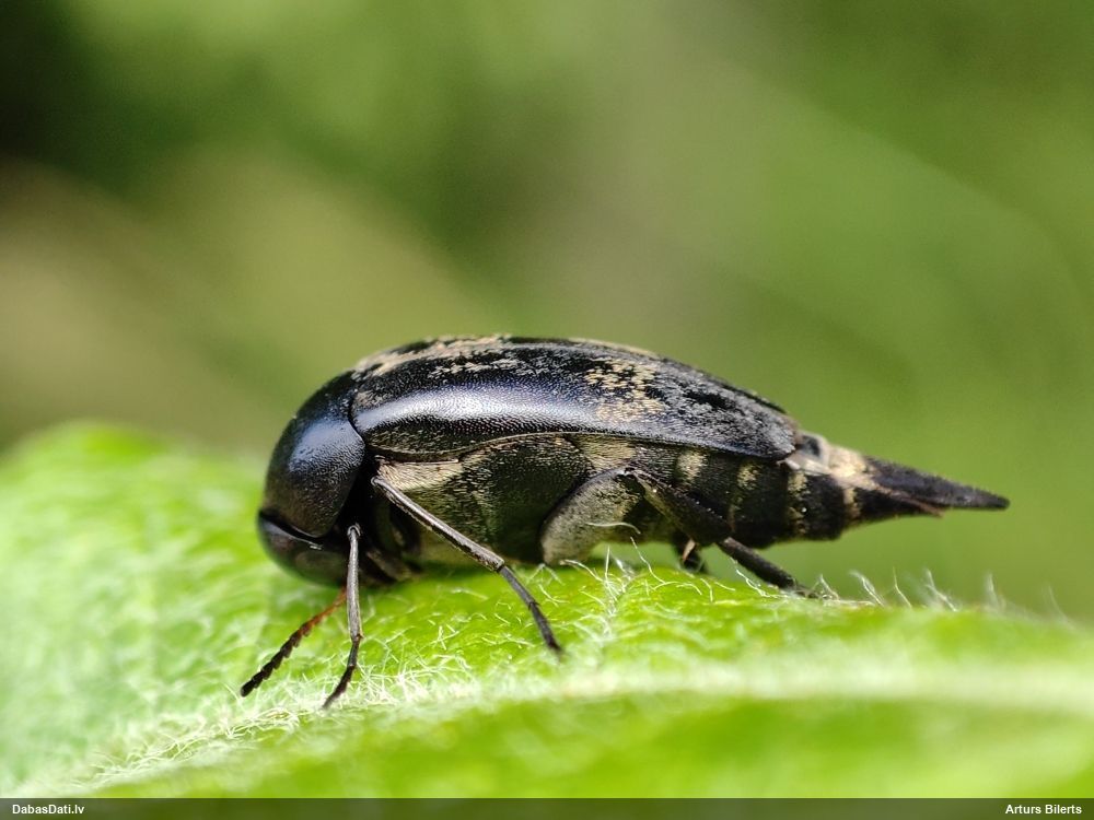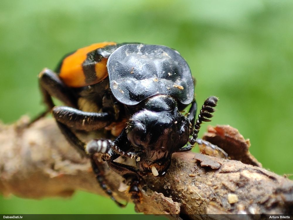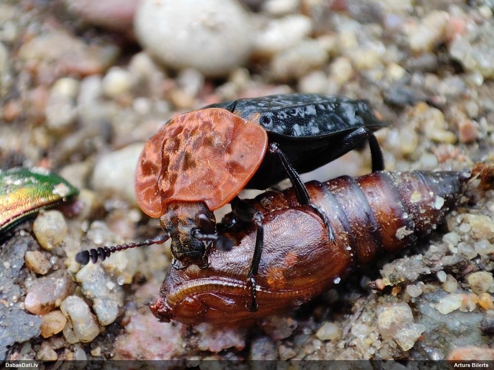 Jāredz tuvāk (kaut vai izkadrēts šis pats attēls) - varbūt tumšā eļļasvabole (Meloe proscarabaeus)