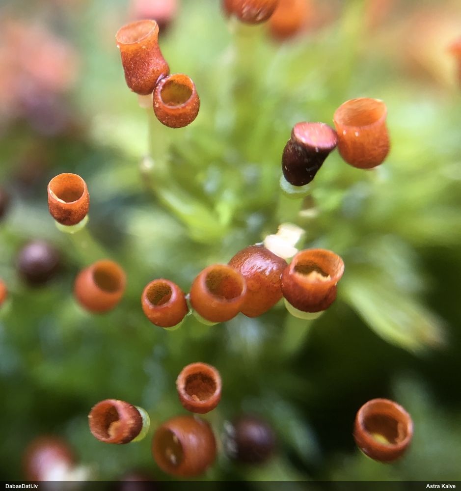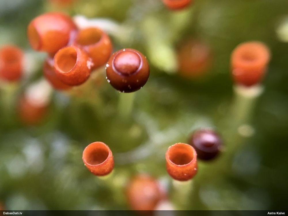 Man pēkšņi radās ideja - vai tur bija nu ļoti mitrs mikroklimats, egle ar melnalksni? Hipotētiski tādas dzeltenas var būt Diachea muscorum. Te bilde ir mazliet līdzīga: https://fr.wikipedia.org/wiki/Fichier:Craterium_muscorum,_Trawscoed,_North_Wales,_Aug_2016_-_Flickr_-_janetgraham84.jpg