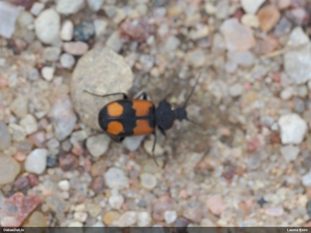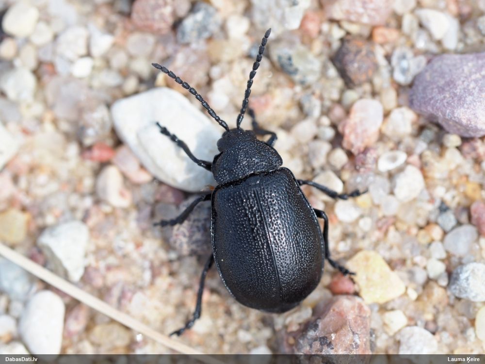 Jāredz tuvāk (kaut vai izkadrēts šis pats attēls) - varbūt tumšā eļļasvabole (Meloe proscarabaeus)