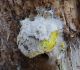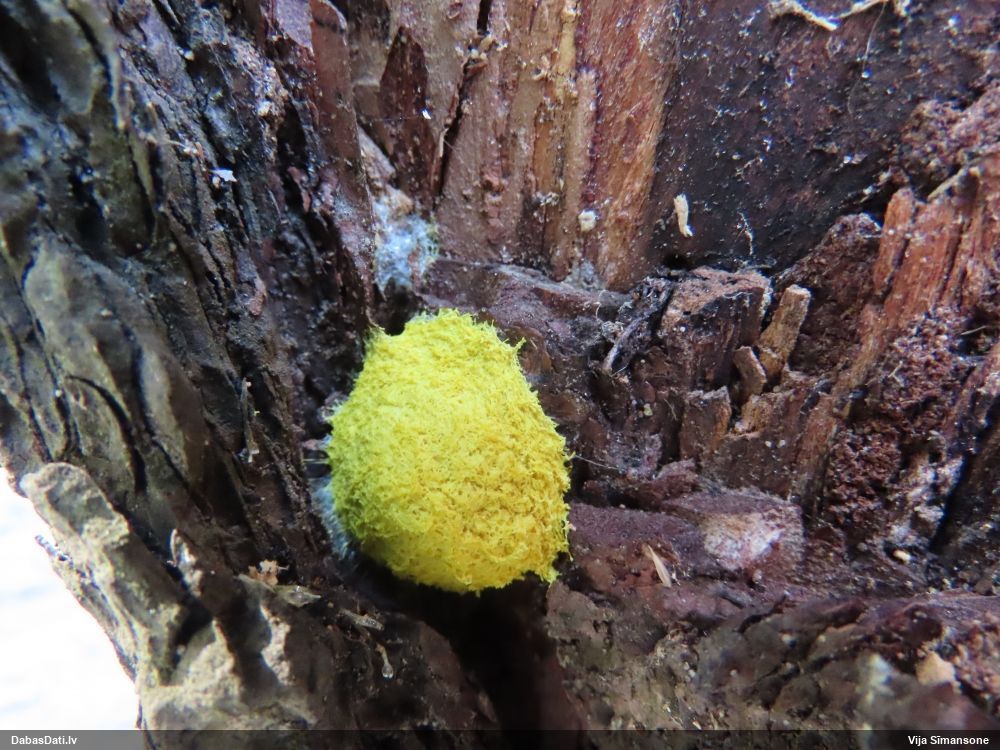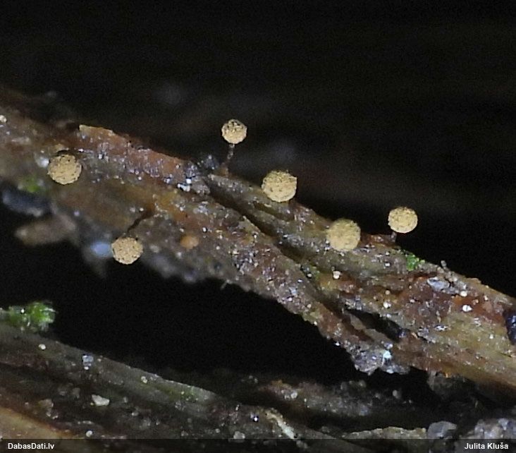 Man pēkšņi radās ideja - vai tur bija nu ļoti mitrs mikroklimats, egle ar melnalksni? Hipotētiski tādas dzeltenas var būt Diachea muscorum. Te bilde ir mazliet līdzīga: https://fr.wikipedia.org/wiki/Fichier:Craterium_muscorum,_Trawscoed,_North_Wales,_Aug_2016_-_Flickr_-_janetgraham84.jpg