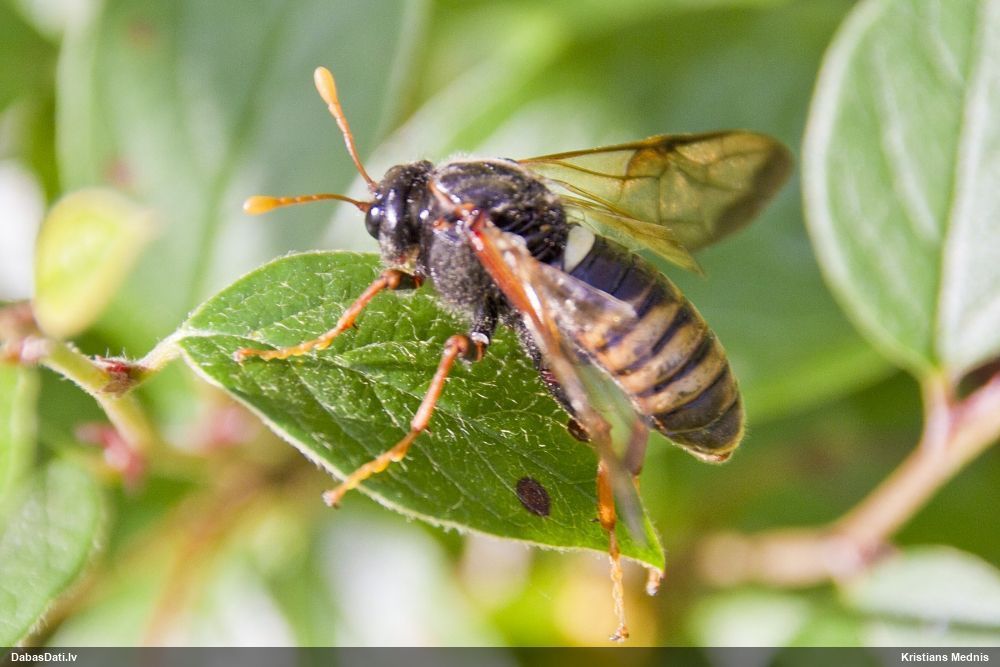 Jāredz tuvāk (kaut vai izkadrēts šis pats attēls) - varbūt tumšā eļļasvabole (Meloe proscarabaeus)