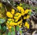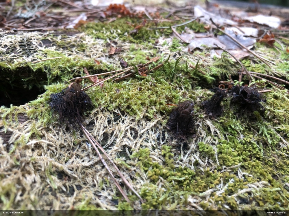 Man pēkšņi radās ideja - vai tur bija nu ļoti mitrs mikroklimats, egle ar melnalksni? Hipotētiski tādas dzeltenas var būt Diachea muscorum. Te bilde ir mazliet līdzīga: https://fr.wikipedia.org/wiki/Fichier:Craterium_muscorum,_Trawscoed,_North_Wales,_Aug_2016_-_Flickr_-_janetgraham84.jpg