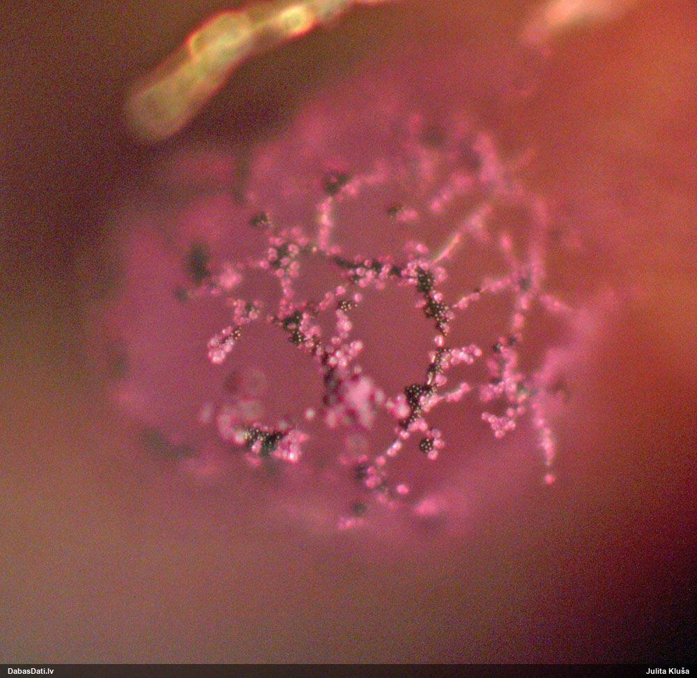 Nav dzelksnīte, jo starp kaļķainajiem mezgliem ir kapilīcija pavedieni bez kaļķa. Ja ir kājiņas un sporas tumšas ar gaišu līniju, tad jābūt Physarum notabile
