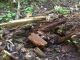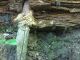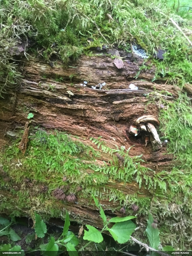 Satrūdējusi kritala mežā, nav dēļi. Iespējams, egle, jauktu koku mežs.