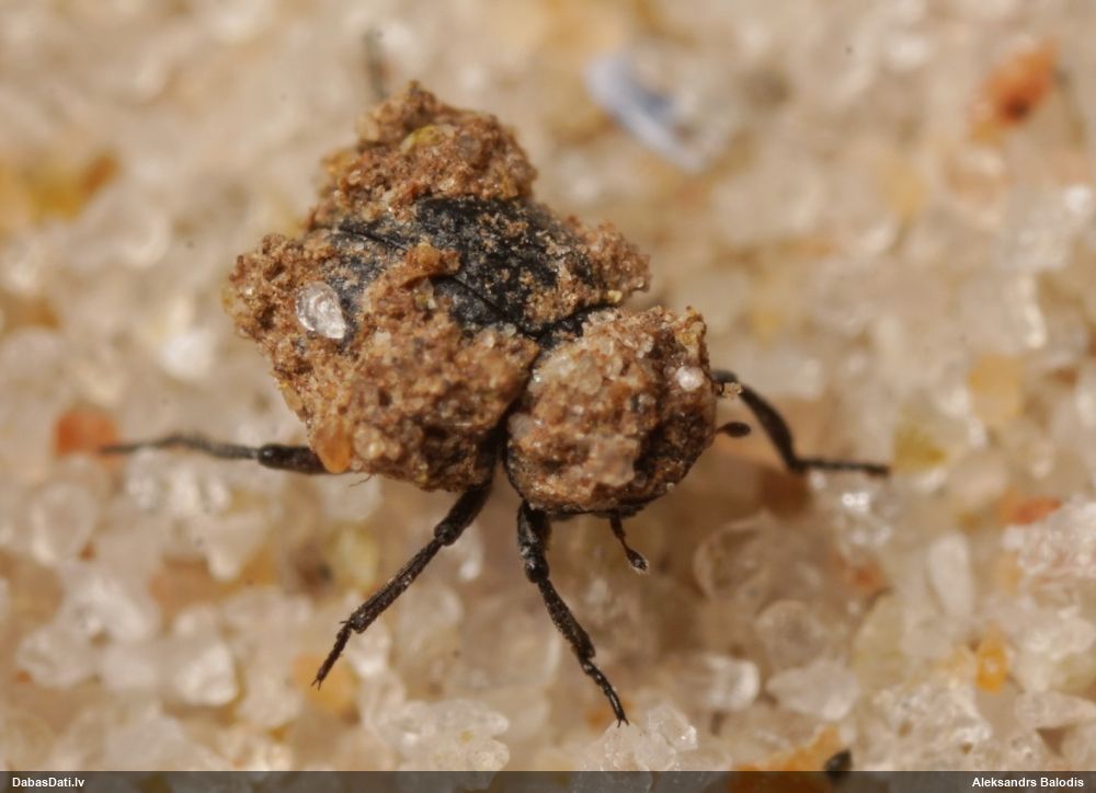Jāredz tuvāk (kaut vai izkadrēts šis pats attēls) - varbūt tumšā eļļasvabole (Meloe proscarabaeus)