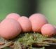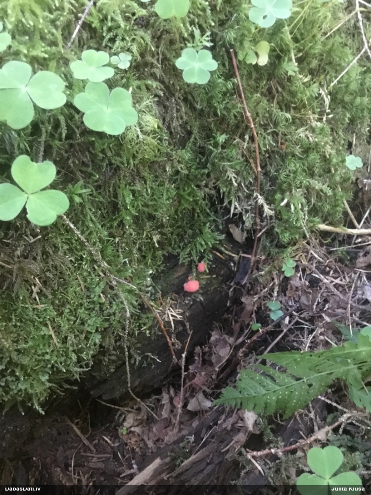 Man pēkšņi radās ideja - vai tur bija nu ļoti mitrs mikroklimats, egle ar melnalksni? Hipotētiski tādas dzeltenas var būt Diachea muscorum. Te bilde ir mazliet līdzīga: https://fr.wikipedia.org/wiki/Fichier:Craterium_muscorum,_Trawscoed,_North_Wales,_Aug_2016_-_Flickr_-_janetgraham84.jpg