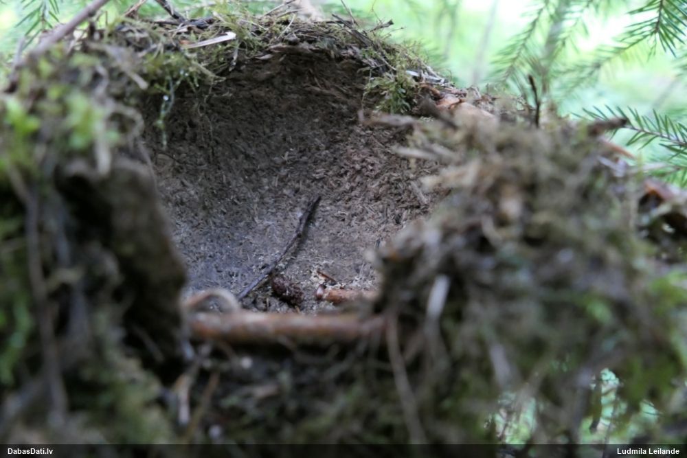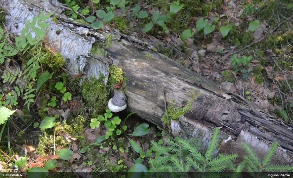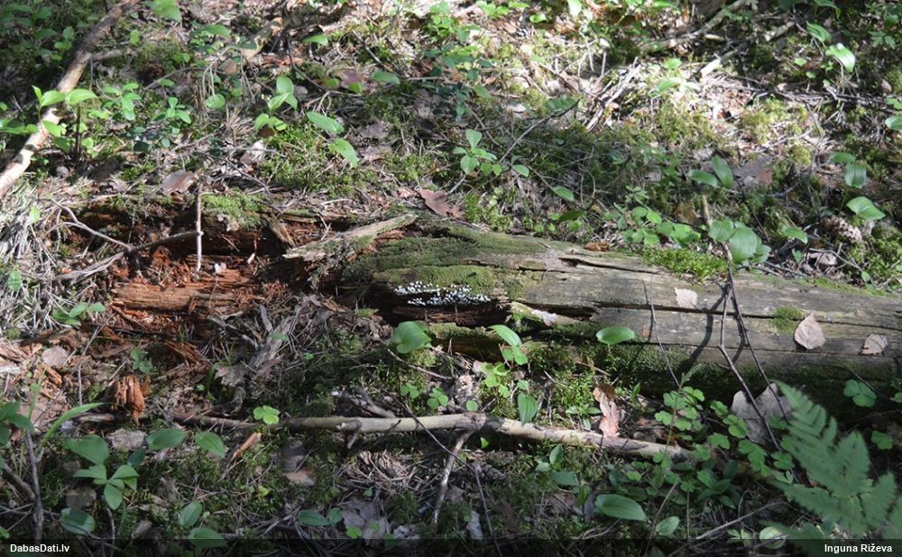 Satrūdējusi kritala mežā, nav dēļi. Iespējams, egle, jauktu koku mežs.