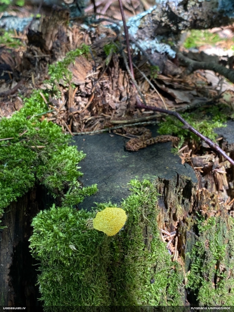 Man pēkšņi radās ideja - vai tur bija nu ļoti mitrs mikroklimats, egle ar melnalksni? Hipotētiski tādas dzeltenas var būt Diachea muscorum. Te bilde ir mazliet līdzīga: https://fr.wikipedia.org/wiki/Fichier:Craterium_muscorum,_Trawscoed,_North_Wales,_Aug_2016_-_Flickr_-_janetgraham84.jpg