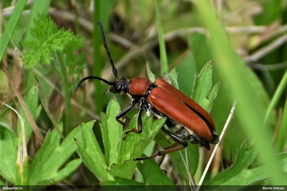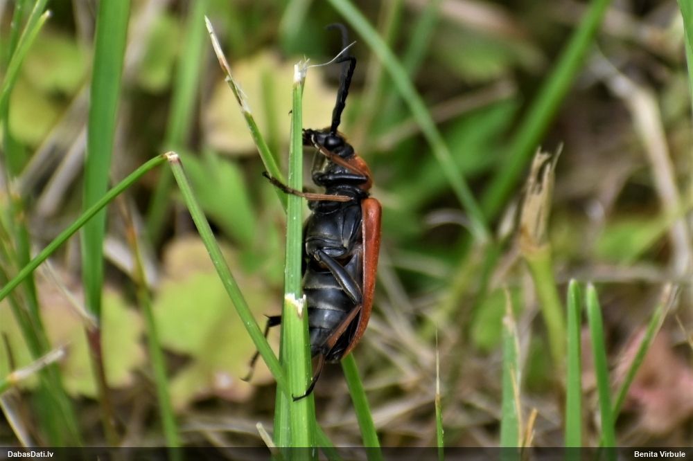 Jāredz tuvāk (kaut vai izkadrēts šis pats attēls) - varbūt tumšā eļļasvabole (Meloe proscarabaeus)