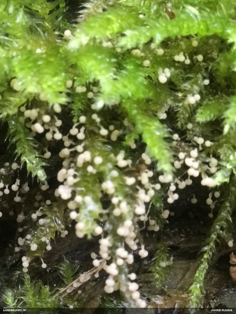 Man pēkšņi radās ideja - vai tur bija nu ļoti mitrs mikroklimats, egle ar melnalksni? Hipotētiski tādas dzeltenas var būt Diachea muscorum. Te bilde ir mazliet līdzīga: https://fr.wikipedia.org/wiki/Fichier:Craterium_muscorum,_Trawscoed,_North_Wales,_Aug_2016_-_Flickr_-_janetgraham84.jpg