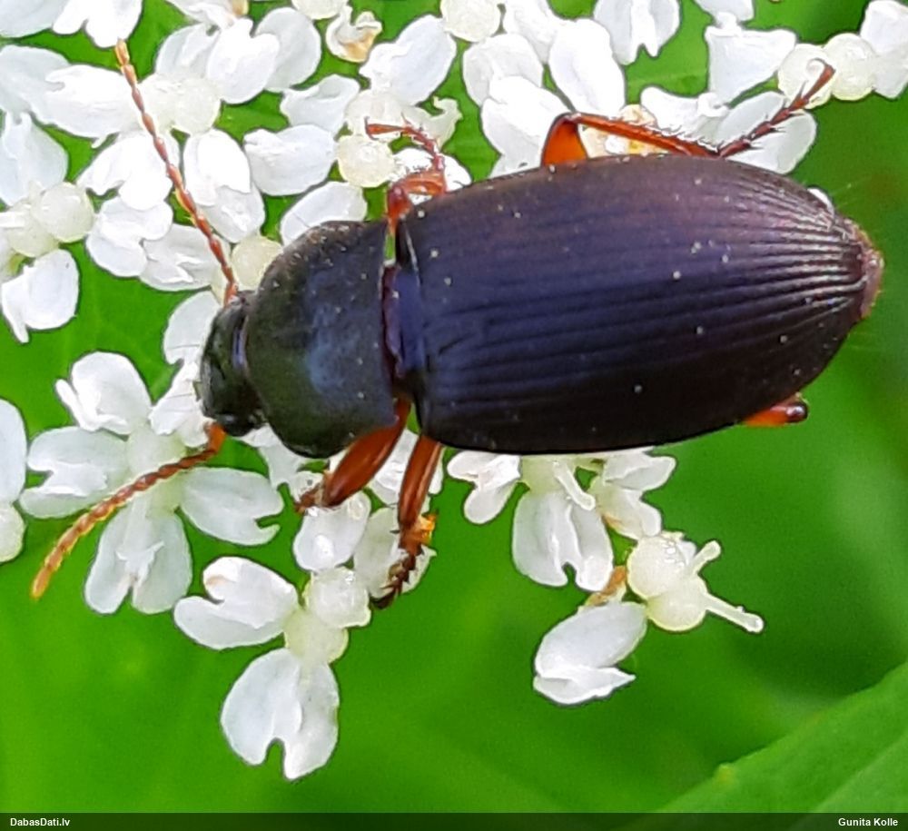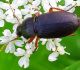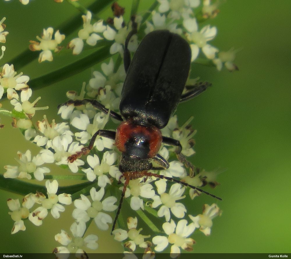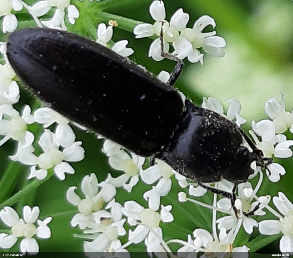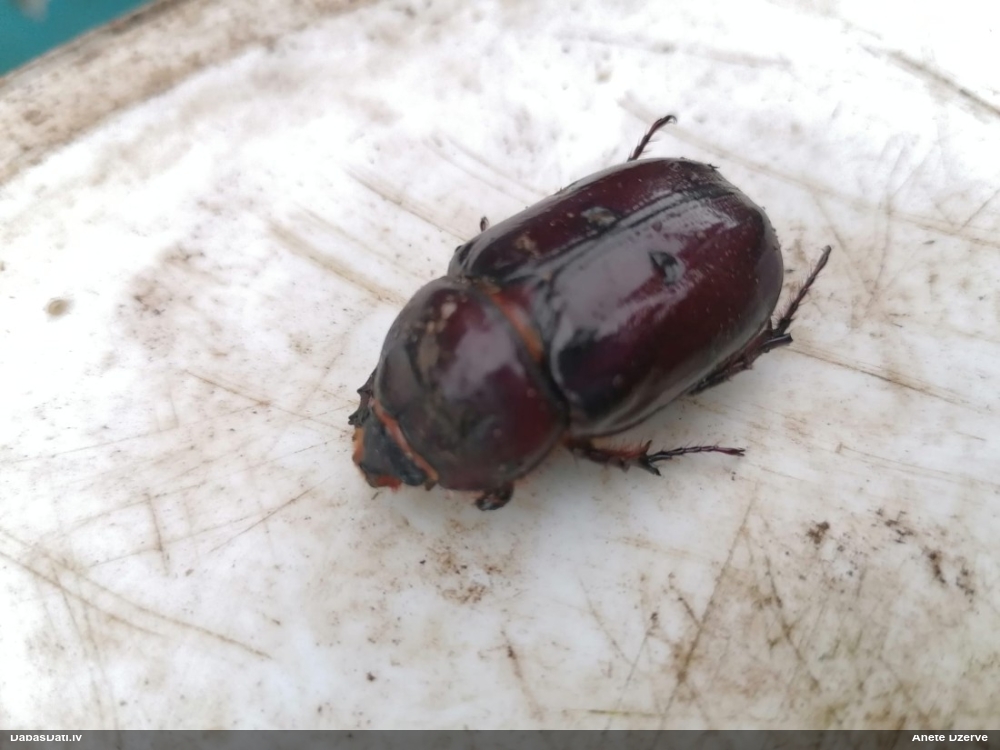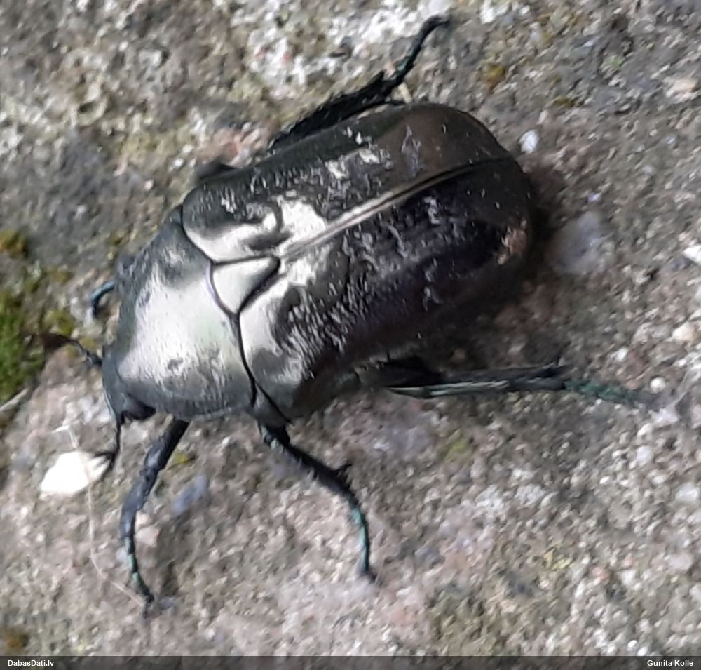 Jāredz tuvāk (kaut vai izkadrēts šis pats attēls) - varbūt tumšā eļļasvabole (Meloe proscarabaeus)