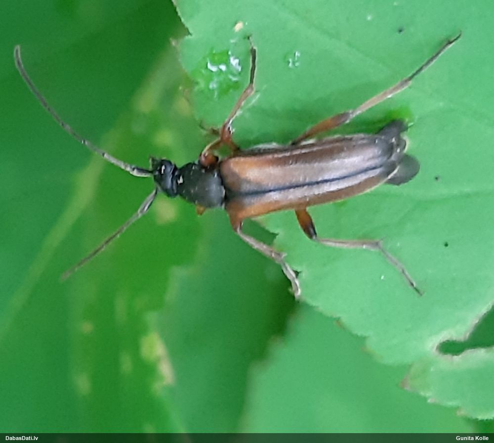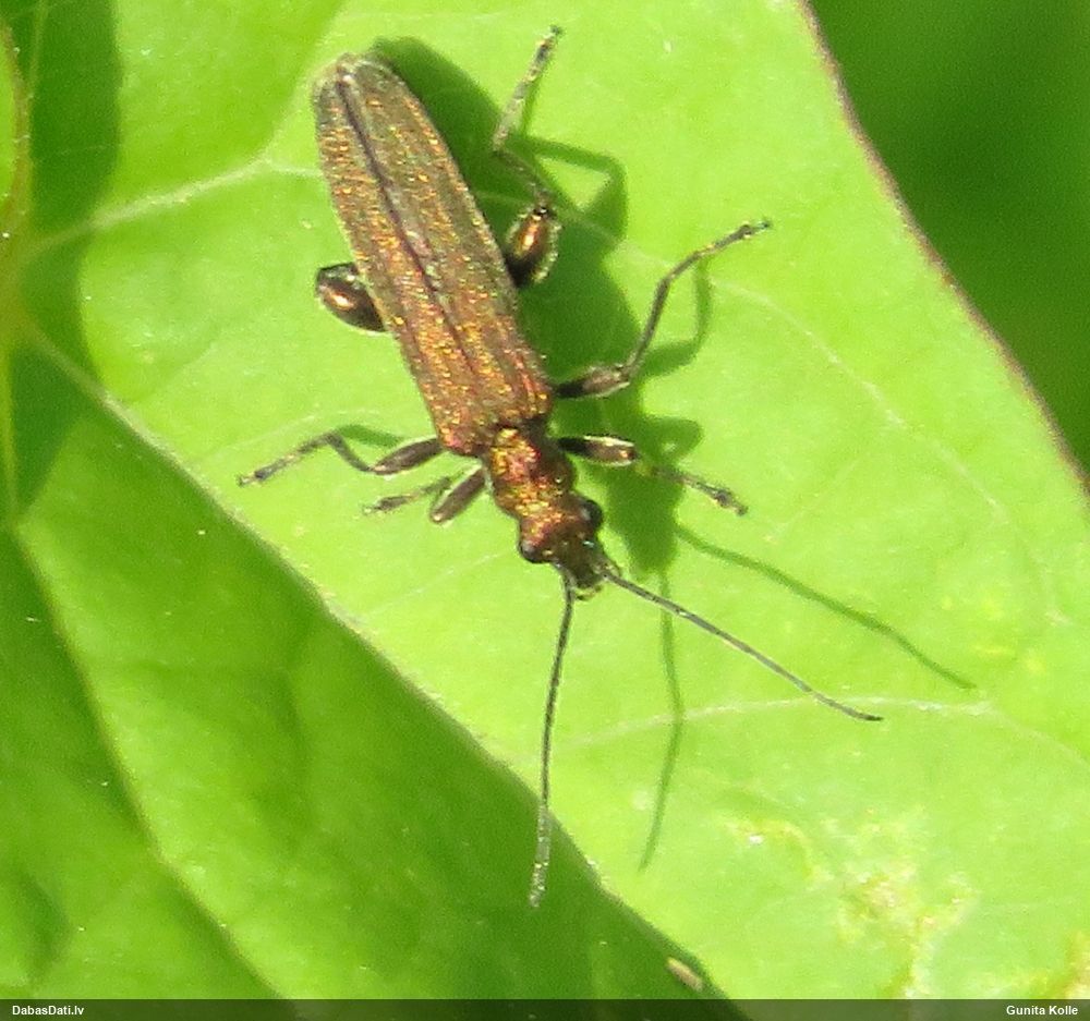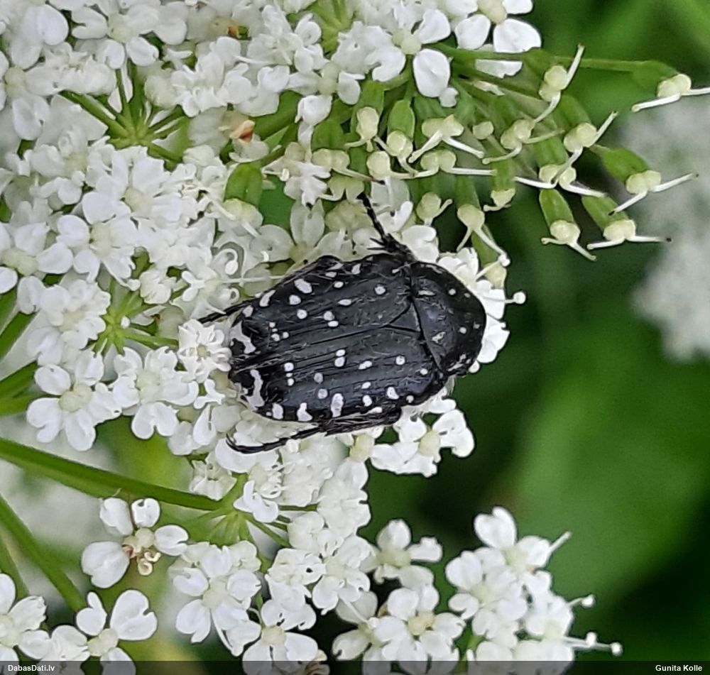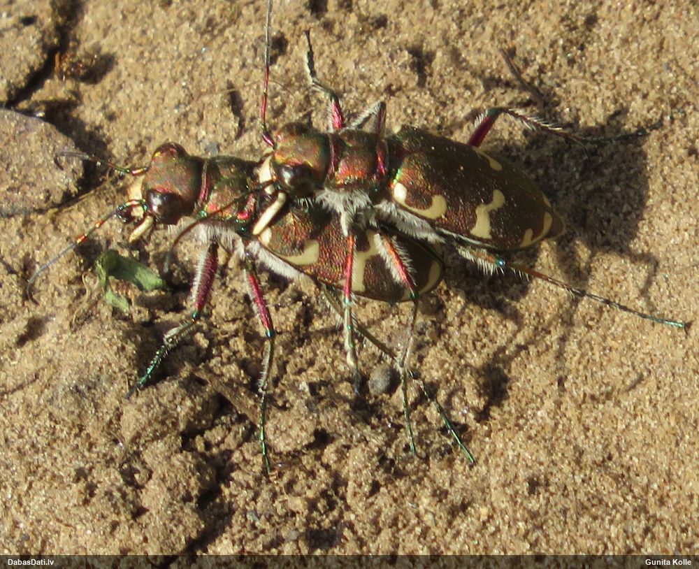 Jāredz tuvāk (kaut vai izkadrēts šis pats attēls) - varbūt tumšā eļļasvabole (Meloe proscarabaeus)