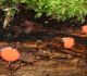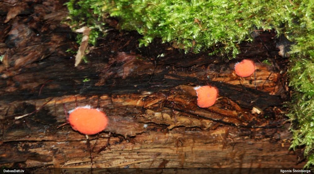 Man pēkšņi radās ideja - vai tur bija nu ļoti mitrs mikroklimats, egle ar melnalksni? Hipotētiski tādas dzeltenas var būt Diachea muscorum. Te bilde ir mazliet līdzīga: https://fr.wikipedia.org/wiki/Fichier:Craterium_muscorum,_Trawscoed,_North_Wales,_Aug_2016_-_Flickr_-_janetgraham84.jpg