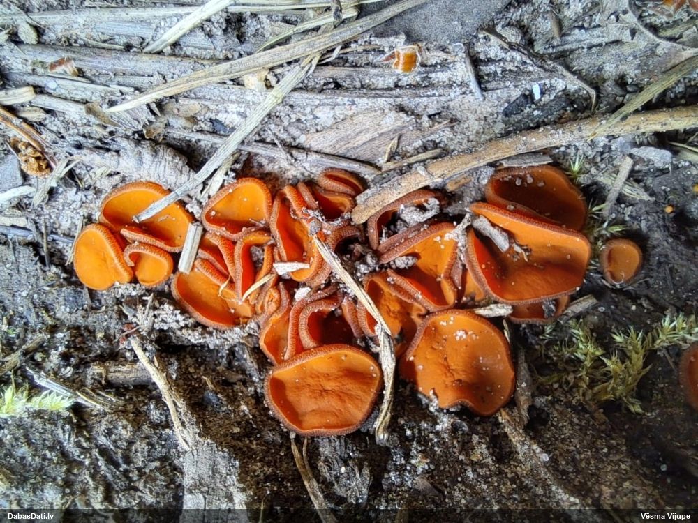 Man pēkšņi radās ideja - vai tur bija nu ļoti mitrs mikroklimats, egle ar melnalksni? Hipotētiski tādas dzeltenas var būt Diachea muscorum. Te bilde ir mazliet līdzīga: https://fr.wikipedia.org/wiki/Fichier:Craterium_muscorum,_Trawscoed,_North_Wales,_Aug_2016_-_Flickr_-_janetgraham84.jpg