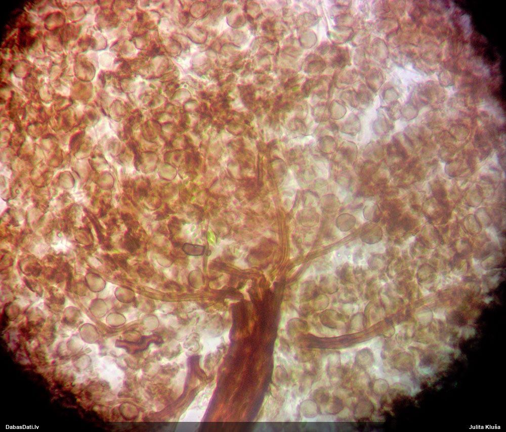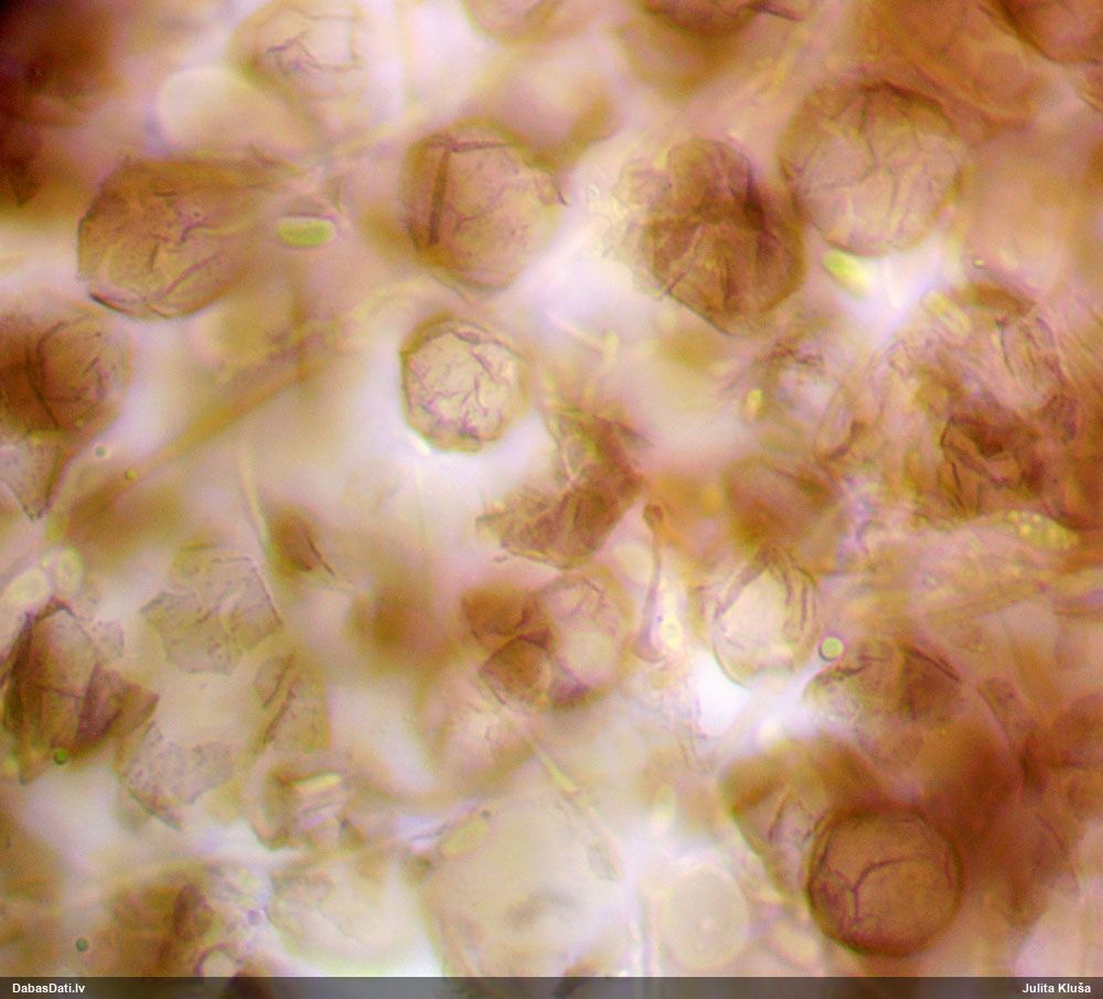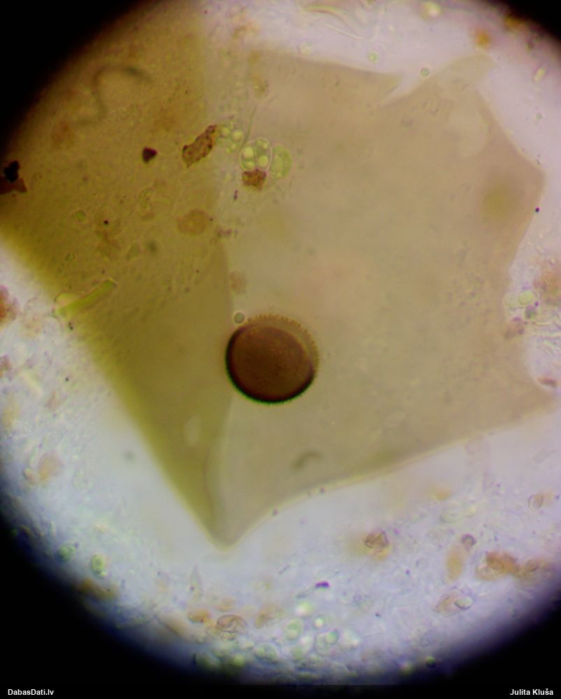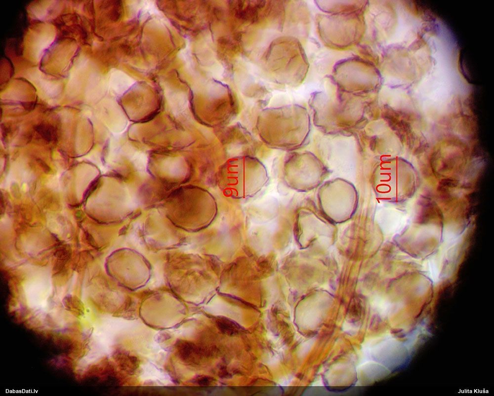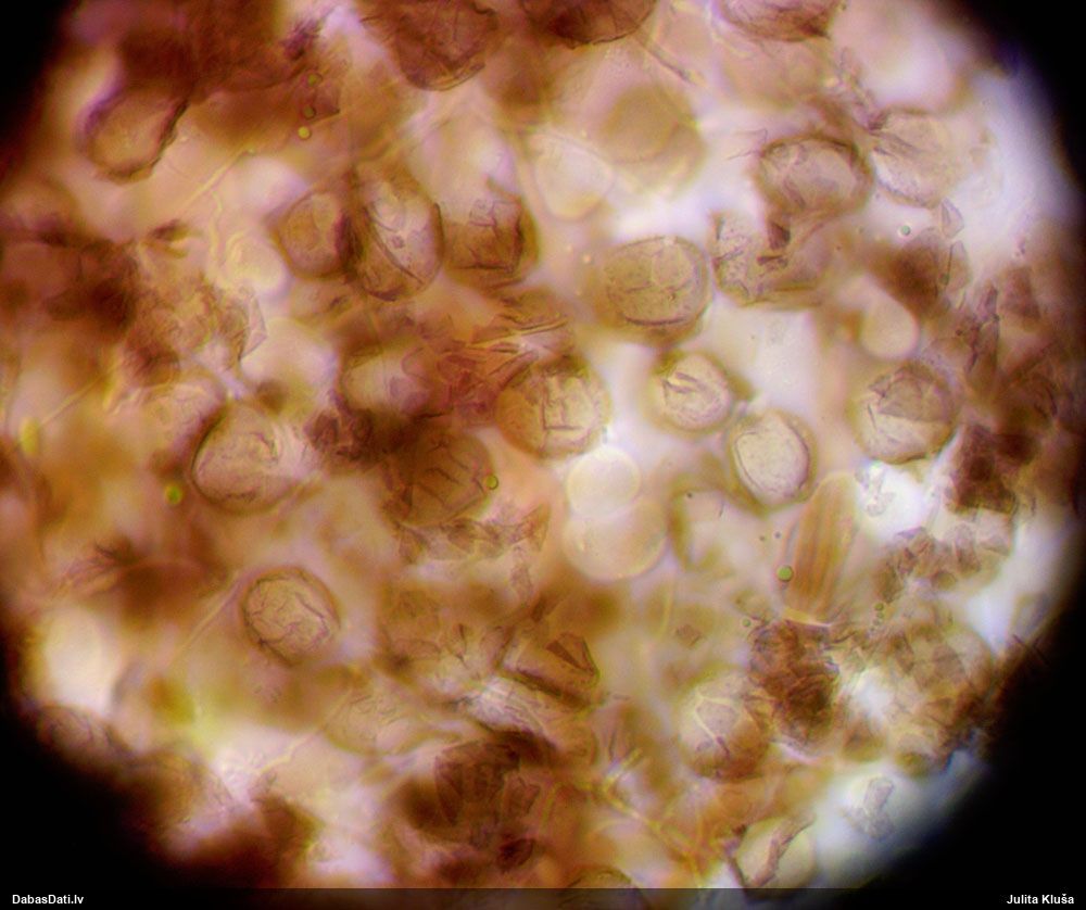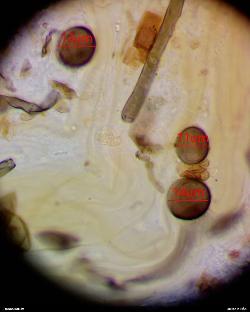 Sporas izskatās ļoti gaišas, varbūt nenobriedušas. Es laikam pēc kāda laiciņa mēģinātu vēlreiz mikroskopēt. Tajā pašā laikā sporu izmēri priekš T.contorta ir pamazi (ja tipiski ir 11-14 mkm, te ir knapi 11 mkm)