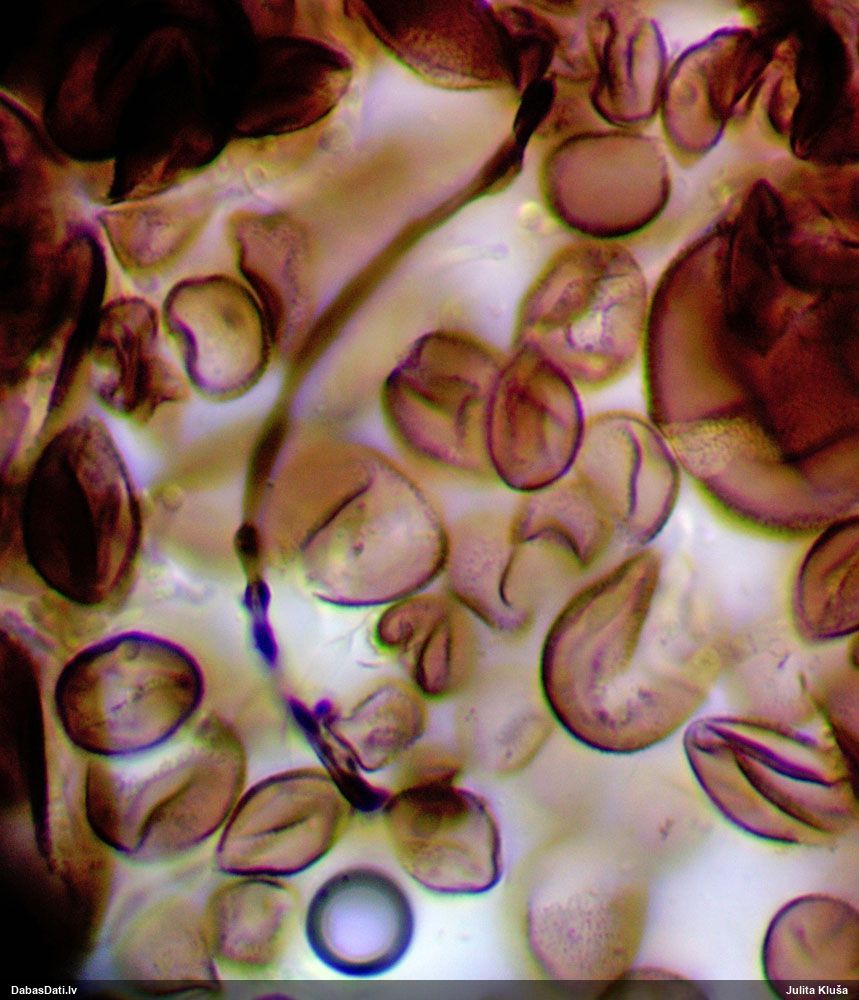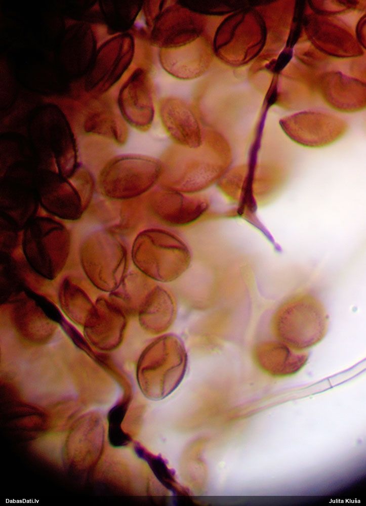 Sporas izskatās ļoti gaišas, varbūt nenobriedušas. Es laikam pēc kāda laiciņa mēģinātu vēlreiz mikroskopēt. Tajā pašā laikā sporu izmēri priekš T.contorta ir pamazi (ja tipiski ir 11-14 mkm, te ir knapi 11 mkm)