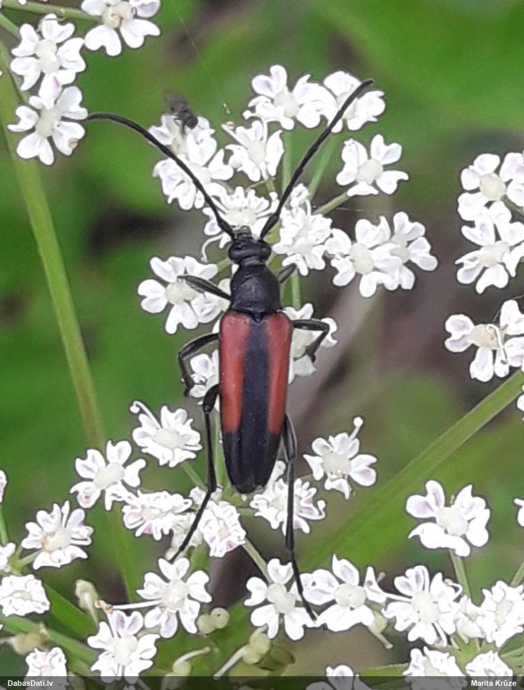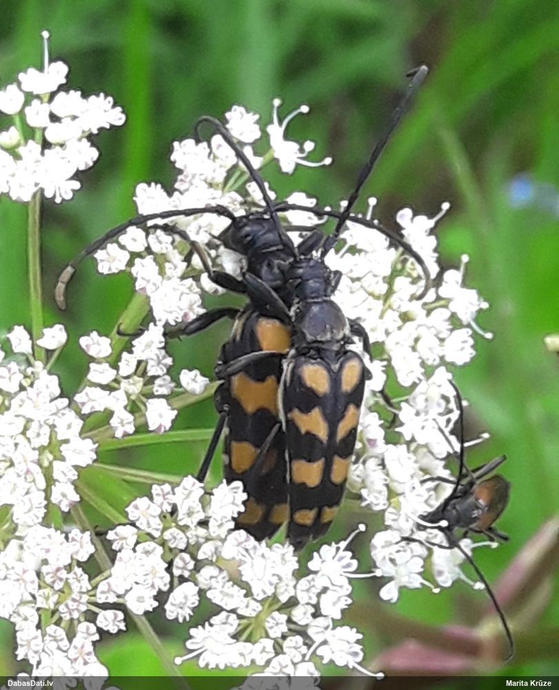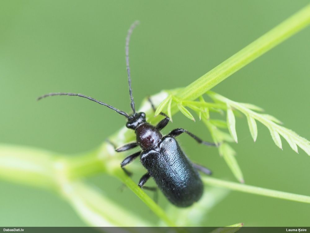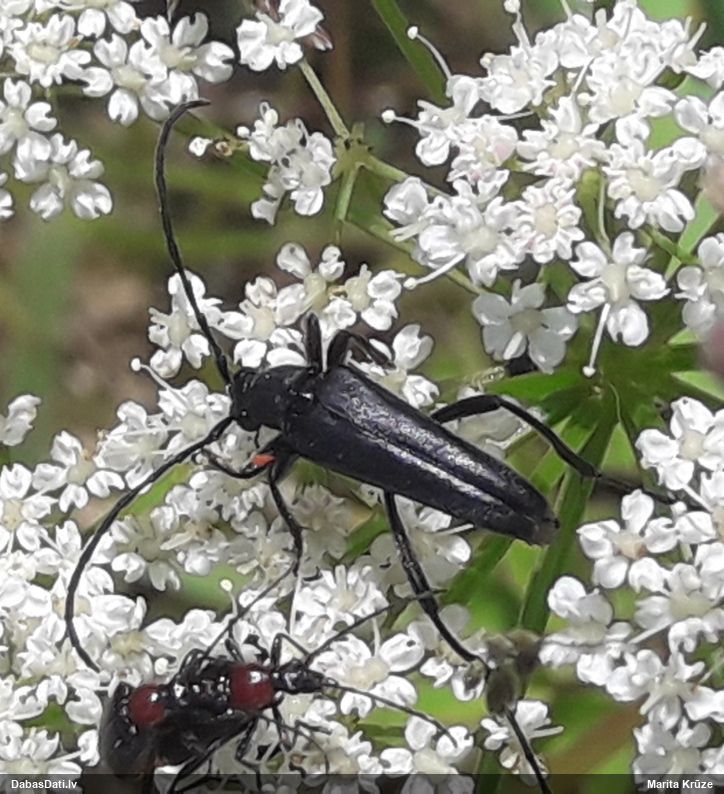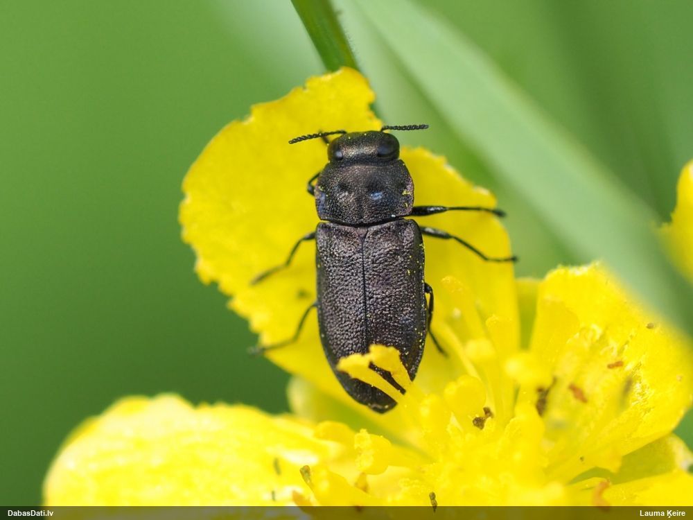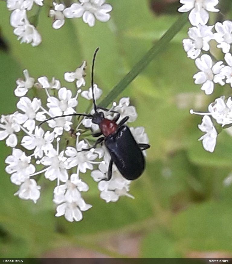 Jāredz tuvāk (kaut vai izkadrēts šis pats attēls) - varbūt tumšā eļļasvabole (Meloe proscarabaeus)