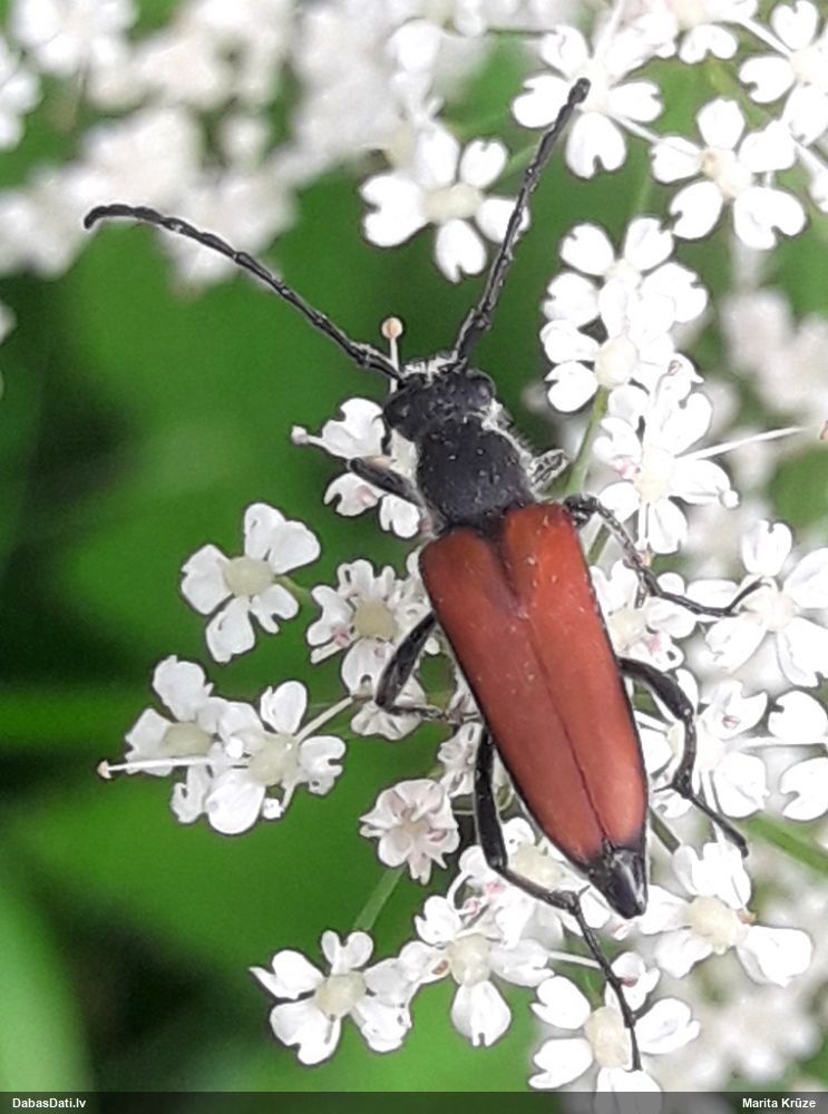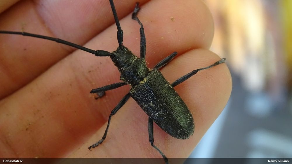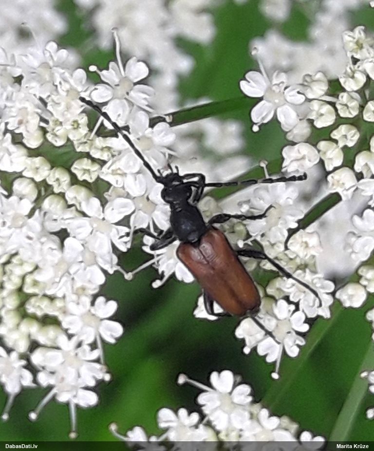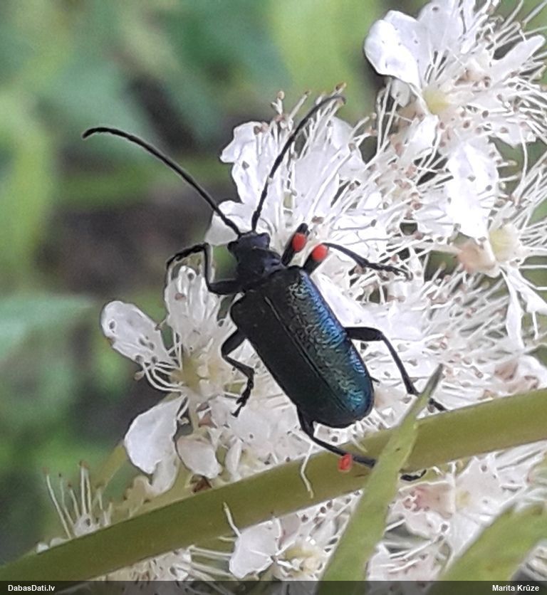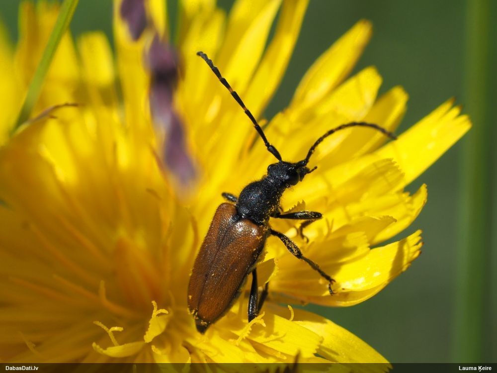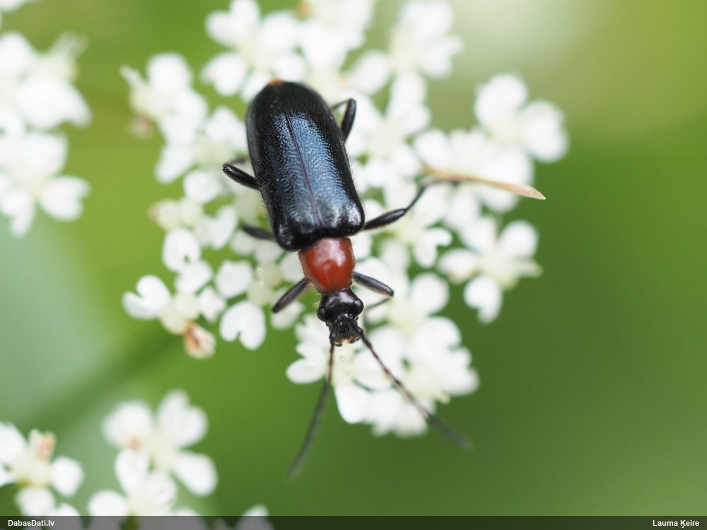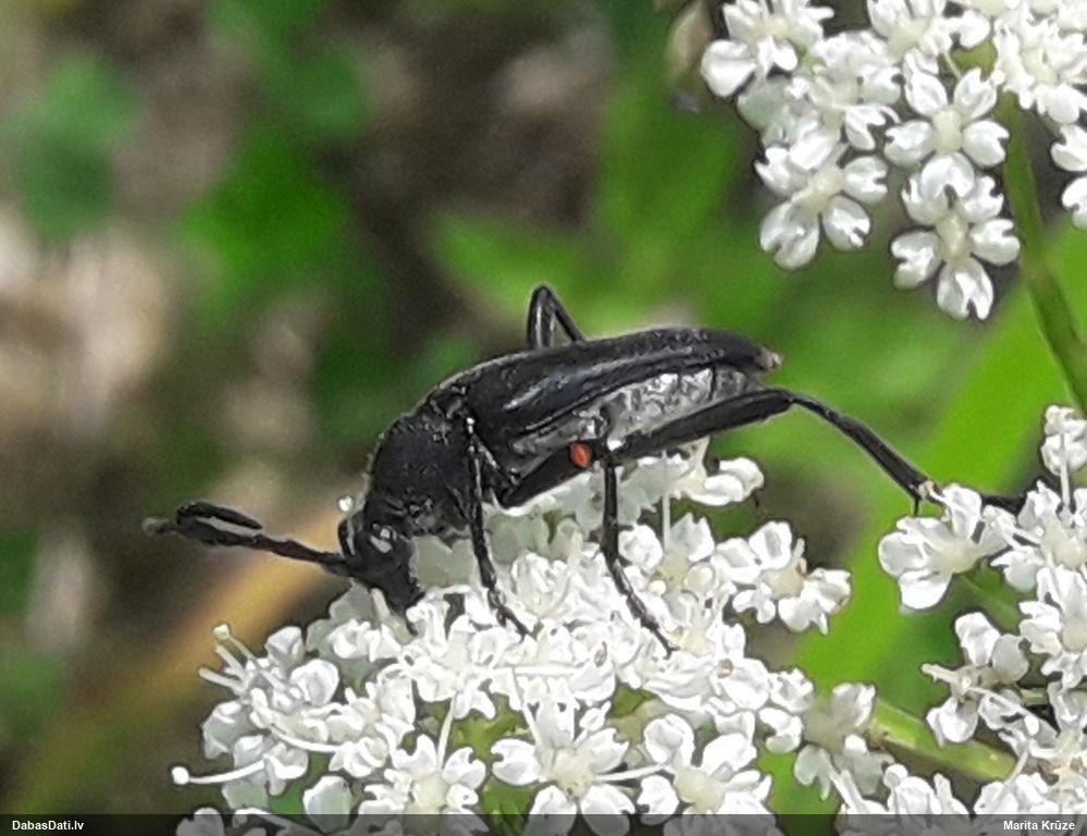 Jāredz tuvāk (kaut vai izkadrēts šis pats attēls) - varbūt tumšā eļļasvabole (Meloe proscarabaeus)
