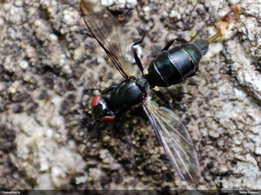 Jāredz tuvāk (kaut vai izkadrēts šis pats attēls) - varbūt tumšā eļļasvabole (Meloe proscarabaeus)