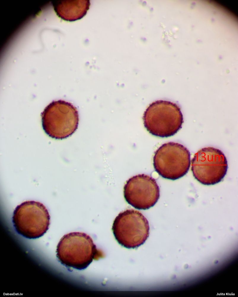 Oho! Tas ir pat vēl interesantāk. Man likās, ka egle. Sporas tumšas, ar tādu izmēru (9,5-11mkm) ātrumā neatrodu. B.panicea būtu gaišas sporas, B.affinis var. microspora - 8-10 mkm. Tas auga uz dzīva alkšņa? Jāpapēta Kuhnt.