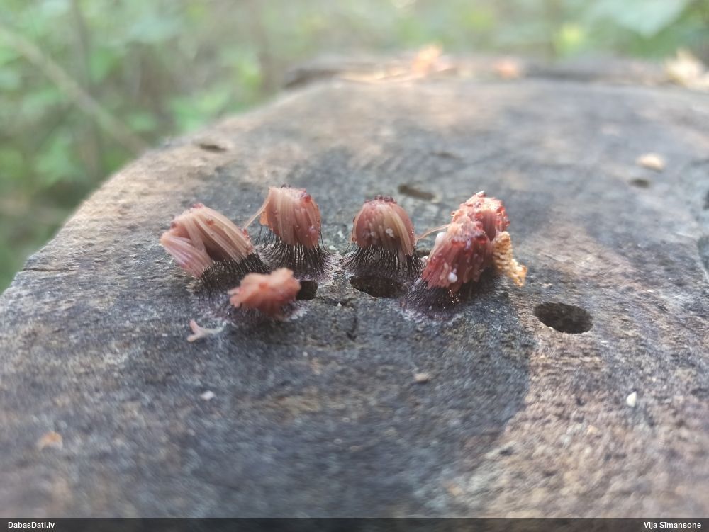 Izskatīju zinātnē aprakstītās Badhamia. Un Badhamiopsis. Tuvākā izskatās Badhamiopsis nivisimulans, kam raksturīgas ciešas grupas uz dzīviem kokiem (bet vai šis ir dzīvs?). Sporas līdzīgas, bet te raksturīgas arī dažas ļoti ovālas un lielas sporas, kādas foto neredz, bet varbūt ir? Un jābūt ar gaišu līniju pāri, to pagaidam neatradu. Bet tonis un kārpas līdzīgas. Izmēram būtu jabūt (10-)11-14 mkm vai ovālām garākām. Es teiktu, ka šai līdzīga, bet cita suga. Bet citu man piedāvājumā pagaidām nav. Pēdējā foto teiktu, ka sporas negrupējas, tad atkrīt B.juliae. Bet tikko pamanīju priekšpēdējo foto un tagad man nav pārliecības, grupējas vai nē.