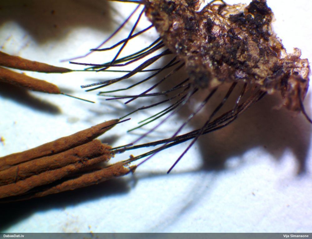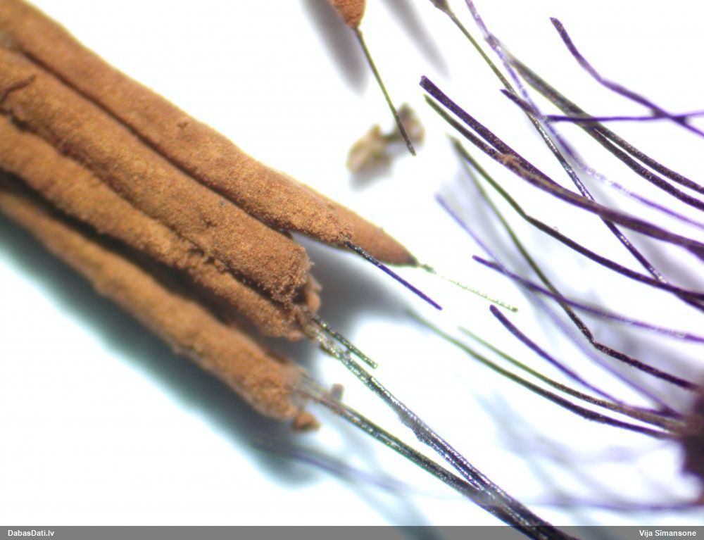 Oho! Tas ir pat vēl interesantāk. Man likās, ka egle. Sporas tumšas, ar tādu izmēru (9,5-11mkm) ātrumā neatrodu. B.panicea būtu gaišas sporas, B.affinis var. microspora - 8-10 mkm. Tas auga uz dzīva alkšņa? Jāpapēta Kuhnt.