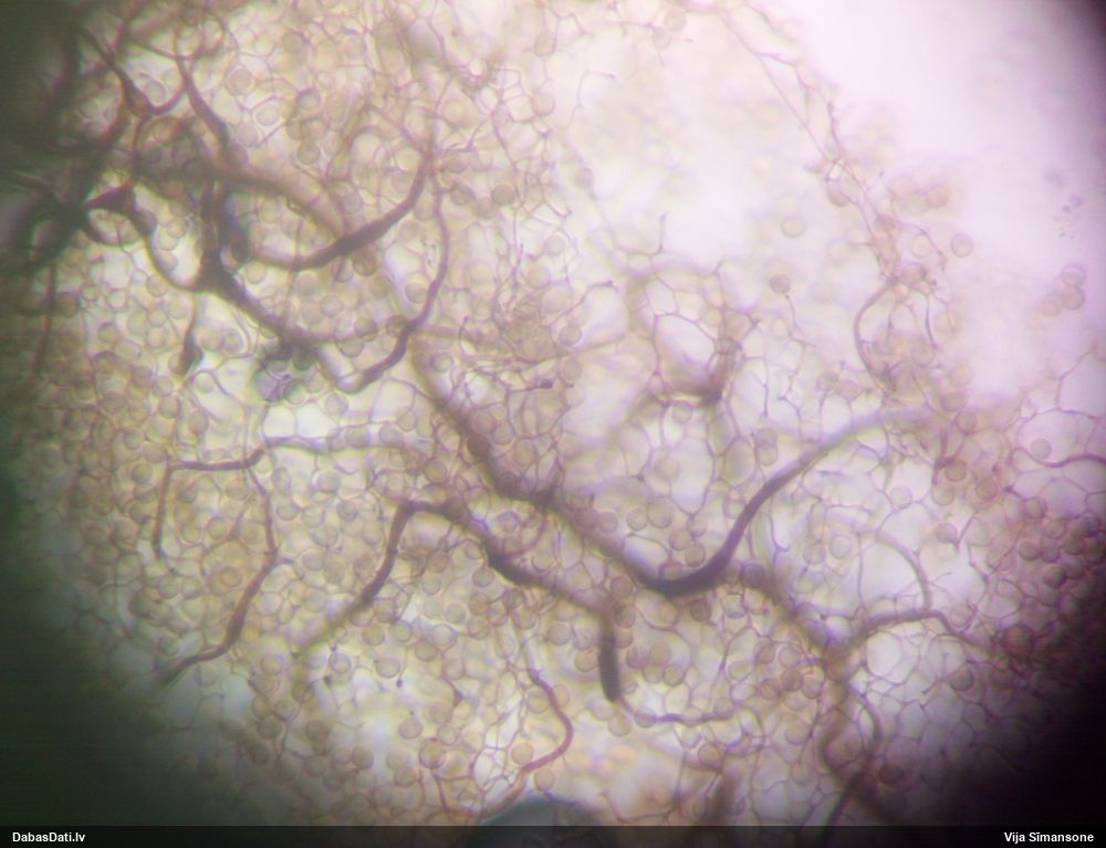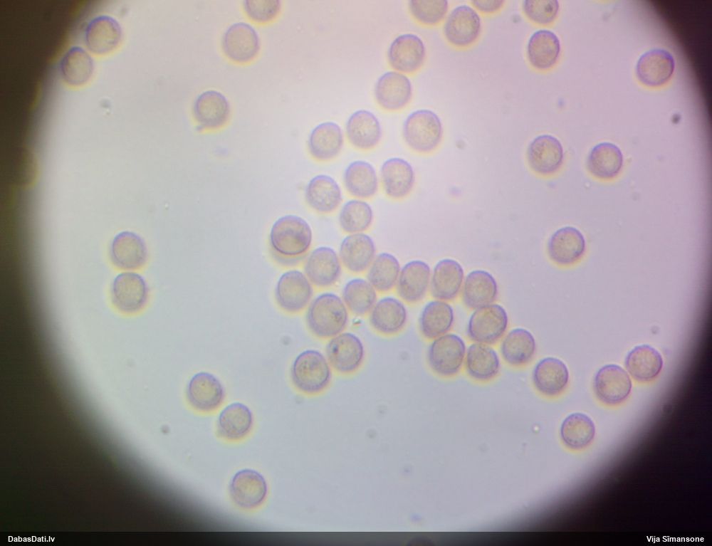 Un ja ir Badhamia, tad vajag arī uz stikliņa bez virsstikliņa mazos palielinājumos (lai nesaslapina okulāru) paskatīties, vai sporas negrupējas, pa divi vai vairāk. Te sporas izskatās ļoti apaļas, drīzāk negrupējas, bet paskatīties tāpat ir vērts.