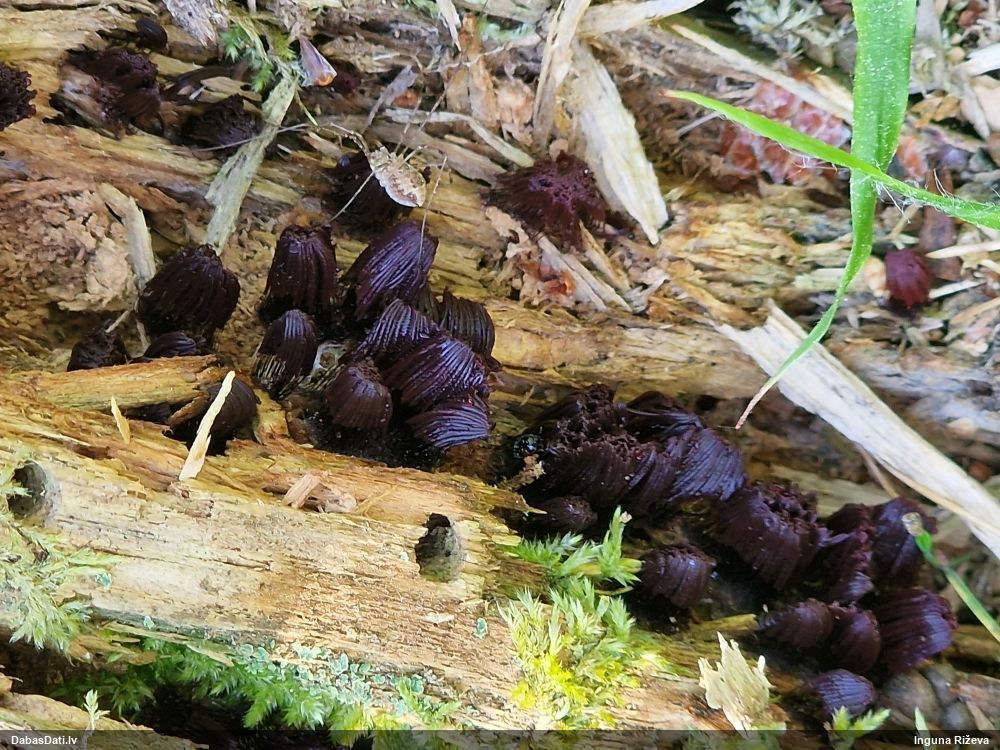 Ja uz beigta koka, tad ticamākā laikam ir B.affinis var. microspora, lai gan tā aug uz mizas. Bet varbūt tieši apakšā gļotsēnēm ir kādi mizas fragmentiņi?