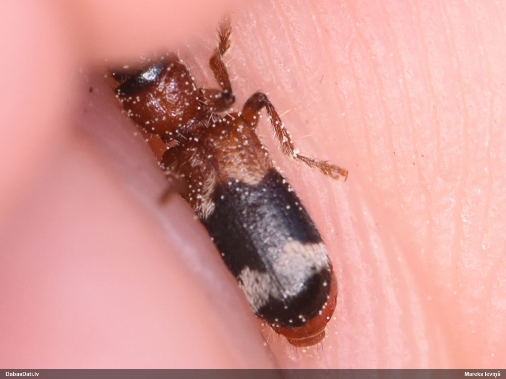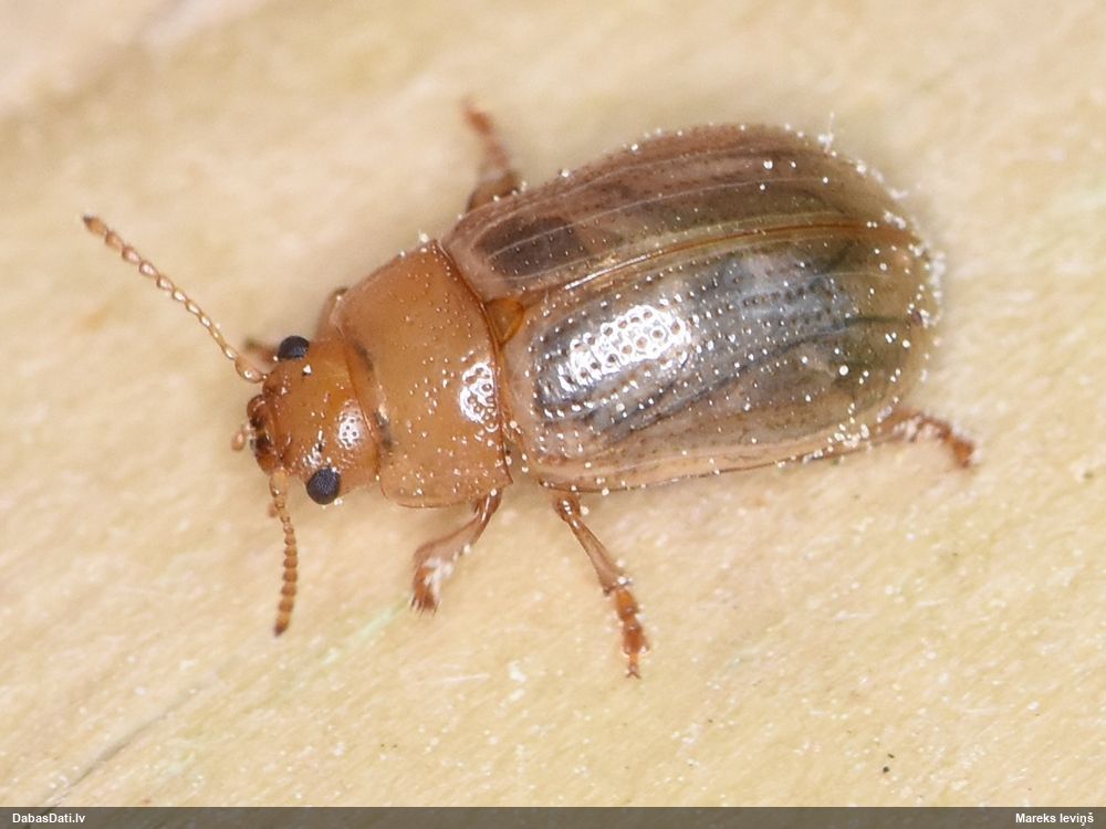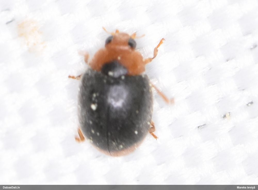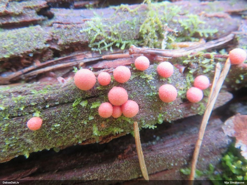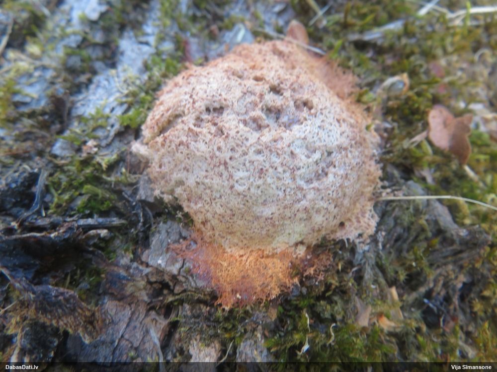 Izskatīju zinātnē aprakstītās Badhamia. Un Badhamiopsis. Tuvākā izskatās Badhamiopsis nivisimulans, kam raksturīgas ciešas grupas uz dzīviem kokiem (bet vai šis ir dzīvs?). Sporas līdzīgas, bet te raksturīgas arī dažas ļoti ovālas un lielas sporas, kādas foto neredz, bet varbūt ir? Un jābūt ar gaišu līniju pāri, to pagaidam neatradu. Bet tonis un kārpas līdzīgas. Izmēram būtu jabūt (10-)11-14 mkm vai ovālām garākām. Es teiktu, ka šai līdzīga, bet cita suga. Bet citu man piedāvājumā pagaidām nav. Pēdējā foto teiktu, ka sporas negrupējas, tad atkrīt B.juliae. Bet tikko pamanīju priekšpēdējo foto un tagad man nav pārliecības, grupējas vai nē.