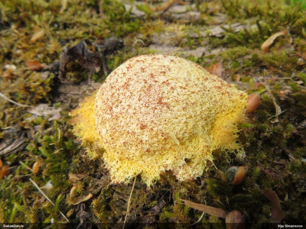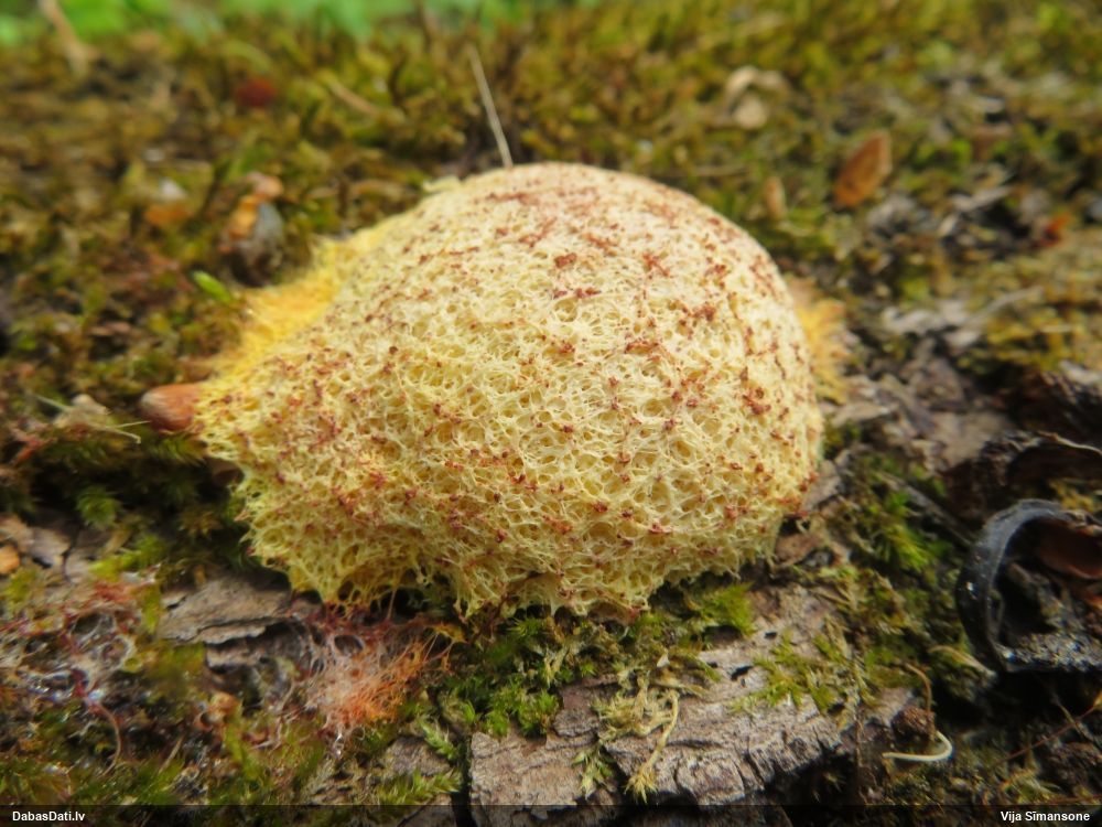 Nezinu, kāpēc šis nav izskatīts kā pēcsniedzīte. 24. marts pavasarī, kad bija daudz sniega. Pēc sporām varētu atbilst divas sugas - Physarum alpinum un Physarum albescens. Abām minētas 2 perīdija kārtas, bet redzu tikai vienu plānu, dzeltenu. Šīm sugām maz foto, bet esošajos arī tās divas kārtas nav uzskatāmi. Kopskats mēdz būt tik dažāds, ka grūti pateikt, cik šis atbilst.
