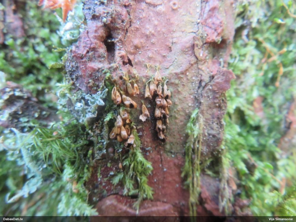 neatceros, kad tik ļoti nevarējusi sagaidīt mikroskopēšanu savam paraugam, kas identisks ar šo novērojumu. Mizaine ir. Vistuvāk no tā, ko paguvu izpētīt, tiešām kārpainā mizaine, bet kapilīcijs, manuprāt, ir mazliet citādāks, nemaz nerunājot par to, ka tā ļoti daudz un pat staipīgs (kārpainajai kapilīcijs maz un nestaipās). Un Neuberta aprakstā tikko iztulkoju par substrātu "Tā substrāts ir gandrīz tikai lapu koku miza, tikai vienā Picea gadījumā, dažreiz arī uz sūnām". Bet mums abām ir pārliecinošas egles un kopīgs izskats, kas atšķiras no kārpainās, nu neticu, ka varētu būt kārpainā. Ticamāk, ka zinātnei jauna suga :D. bet es vēl papētīšu, varbūt kaut kur tomēr ir kas tāds aprakstīts.