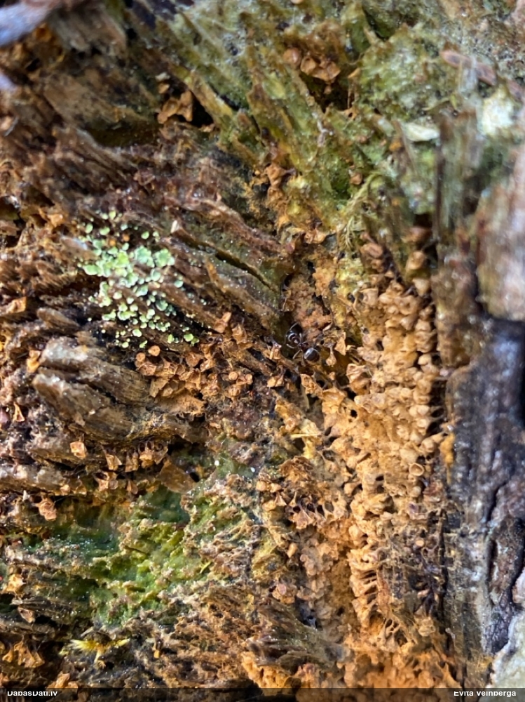 Raivo, nebūs Chaenotheca furfuracea, bet gan C.brachypoda (dabisku mežu indikatorsuga). C.furfuracea ir ar izteiktu laponi, daudz lielāki aķ un košāk zaļa krāsa