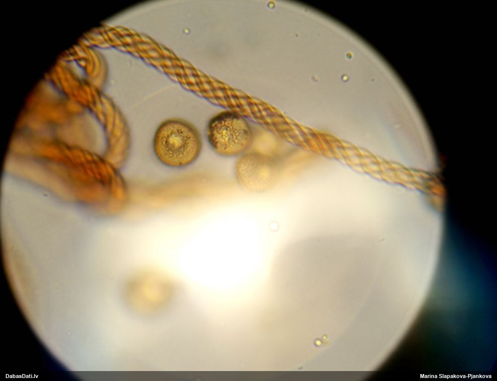 Šis man pašai sanāca pārsteigums. Ievācu paraugu ar domu "varbūt tur ir gļotsēne", dodot varbūtību apmēram pusprocentu, ka ir. Bet no mikroskopijas starp galīgi vecām sporām izdevās atrast ne tikai dažas labas, bet, galvenais, arī perfektus kapilīcija fragmentus, no kura suga, vēl kopā ar sporu pazīmēm, nosakāma nešaubīgi.