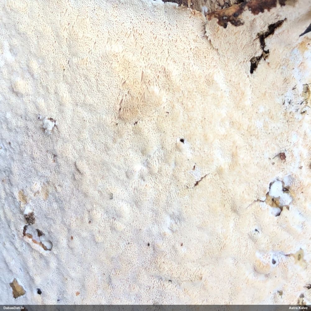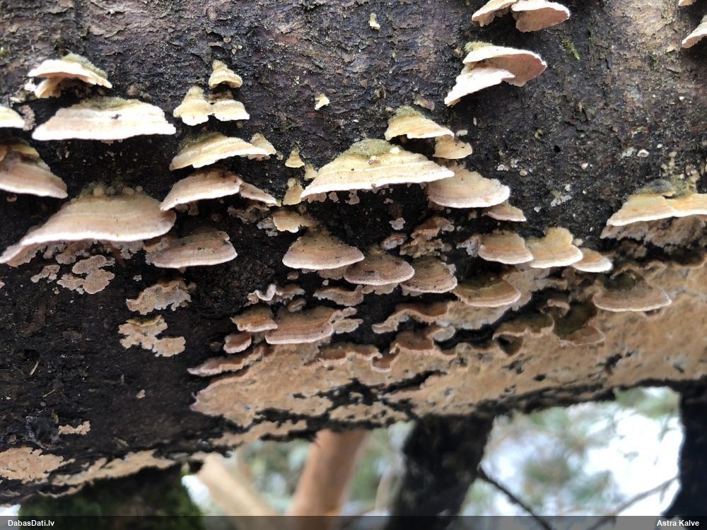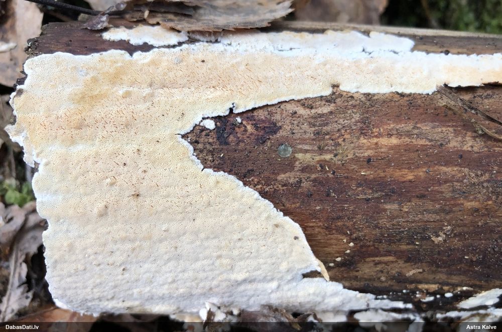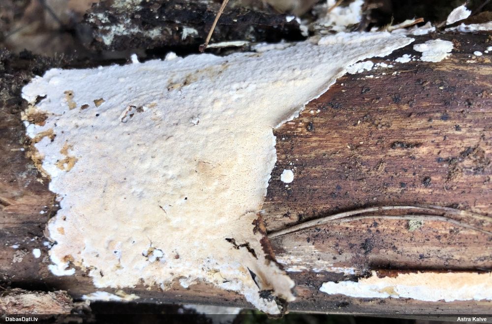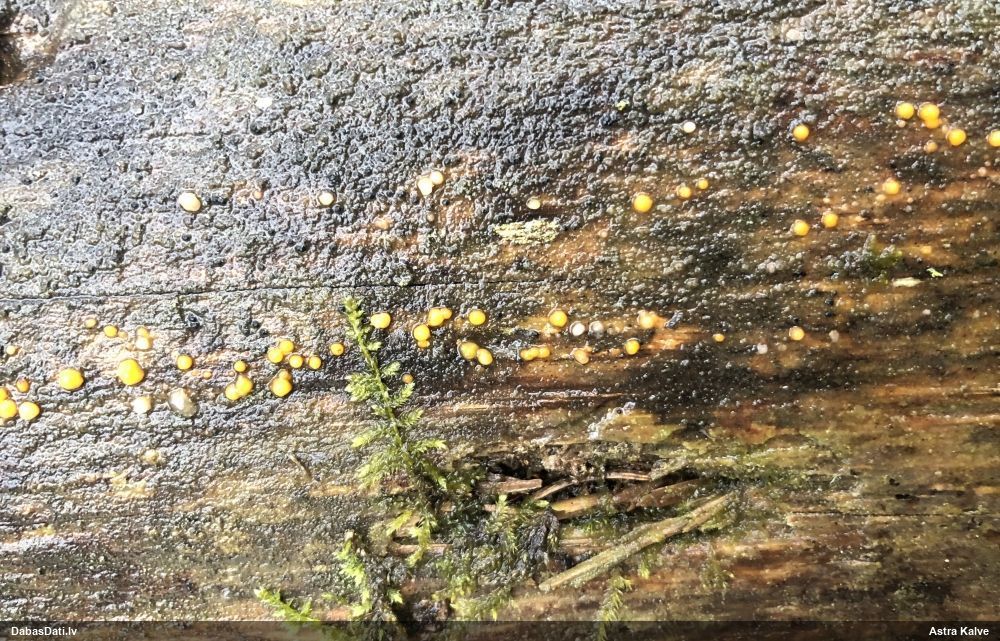 Ja uz beigta koka, tad ticamākā laikam ir B.affinis var. microspora, lai gan tā aug uz mizas. Bet varbūt tieši apakšā gļotsēnēm ir kādi mizas fragmentiņi?
