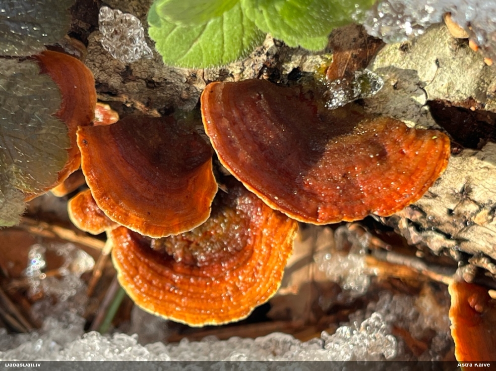 Heterobasidion annosum. Parasti uz priedēm, retāk uz citiem skuju kokiem, vēl retāk uz lapu kokiem, t.sk. uz bērziem.