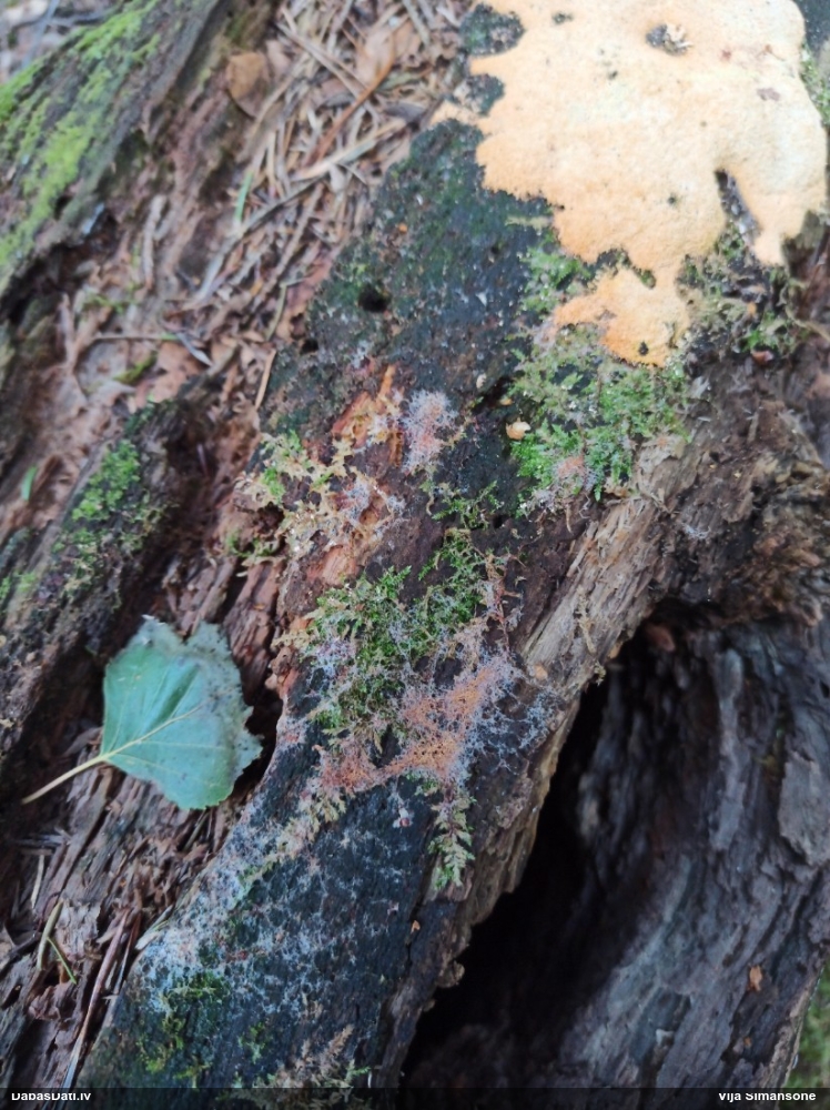Njā, Laimai pamatīgs pētījums... Paldies, Julita, par jauko pārsteigumu! Un tā apse man kā tāda Pandoras lāde, beigās būs jāsaskaita, cik sugu tā man šogad sagādāja. Uzgāju to pērn, vēl gluži jaunu, bet virsū atradu tikai vienu gļotsēni (tā kā ragansviestu, neziņoju) sporu stadijā, apsekoju šogad - pilna miza un zemmiza visādu brīnumu! Un tā rozā krāsa vairākos plazmodijos! Šeit padzēsu liekās bildes, lai novērojums paliek saprotamāks, pārskatāmāks. Un tā vēlā attīstība - piekrītu, ka reti novērota, jo parasti ap tādu laiku ir ja ne sniegs, tad sals noteikti.